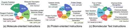 小分子指令:深度探索小分子的固有属性与行为,研究化学反应和分子设计的核心挑战。理解和预测小分子的化学特性,优化分子设计,提高化学反应预测的准确性和效率。其目标是在化学和药物设计领域加速药物的研发进程,同时降低研发成本。 * 蛋白质指令:主要解决蛋白质设计和功能相关的问题。旨在预测蛋白质结构域、功能及活性,通过文本指令推动蛋白质设计。对于疾病的诊断、治疗以及新药的研发工作具有一定的价值。 * 生物文本指令:侧重于生物信息学和化学信息学领域的自然语言处理任务。旨在从生物医学文献中提取和解析关键信息,支持研究人员快速获取知识、便于进行查询。