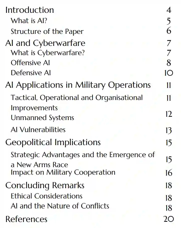 第三部分分析了人工智能的地缘政治影响。这项技术为国家行为体提供了重大战略优势。这些优势吸引他们增加对人工智能的投资,并将其纳入国防能力。这有可能引发新一轮军备竞赛,将人工智能技术武器化。将人工智能系统纳入国防领域也给军事合作带来了挑战,特别是在技术兼容性方面。最后,最后一节将讨论将人工智能纳入安全部门的主要伦理考虑因素。
