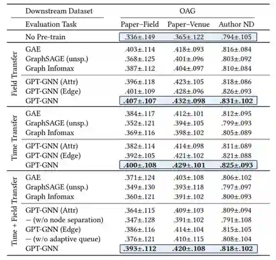 总体而言,我们提出的GPT-GNN在不同的实验设定下显著提高下游任务的性能,平均能达到9.1%的性能提升。