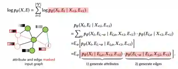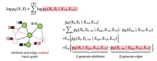 由于我们想同时捕获属性和结构信息,因此需要将每个节点的条件生成概率分解为两项,特征生成与图结构生成。对每一个节点,我们会先掩盖其特征及部分边,仅提供剩下的部分作为已经观测到的边。