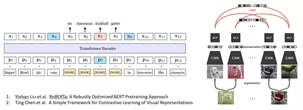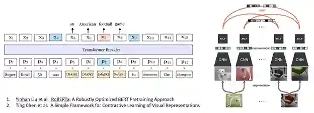 在NLP领域,BERT及其变种的取得了巨大的成功,证明了语言模型作为一个自监督任务,可以帮助训练非常深的Transformer模型,以捕捉语言的底层知识,如语法、句法、词义等。同样,在CV领域,最近的工作如SimCLR也显示出通过对比学习(Contrastive Learning) 对ResNet进行预训练也可以显著提升泛化性能。这些成功表明,无标注数据本身包含丰富的语义知识,因此如果通过预训练可以使模型能捕捉无标注数据的分布,就能作为初始化帮助一系列下游任务。