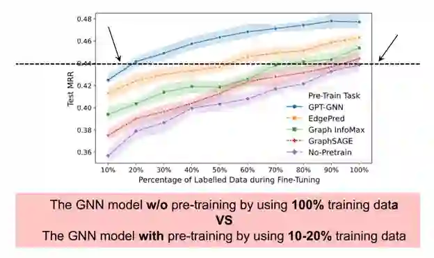 我们还评估了在不同百分比的标记数据下,GPT-GNN是否依然能取得提升。我们可以看到,使用GPT预训练时,仅使用20%标签数据的模型性能就会比使用100%数据进行直接监督学习的模型性能更高。这显示了预训练的有效性,尤其是在标签稀缺时。