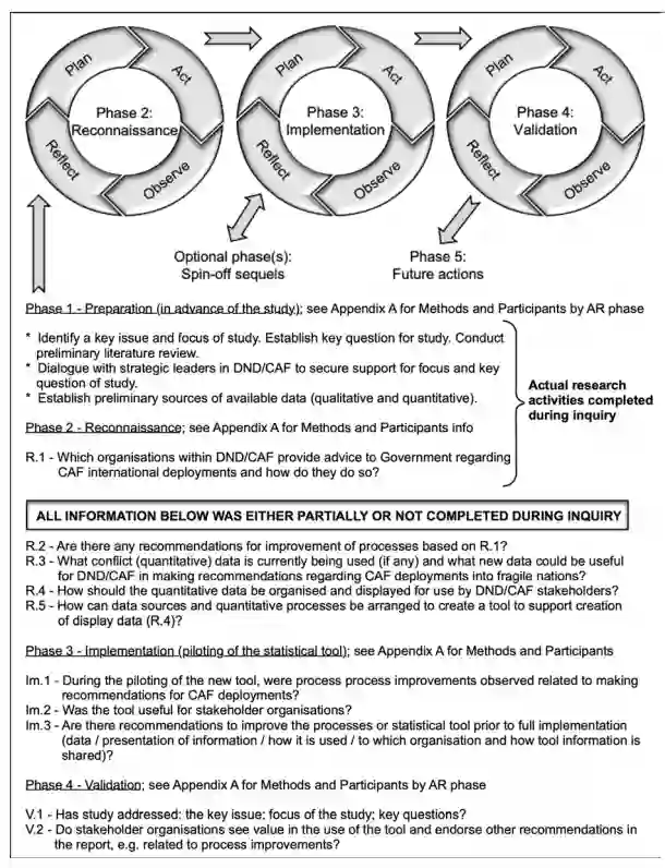 本研究审视了加拿大国防部(DND)及加拿大武装部队(CAF)内开展的行动研究(AR),详述相关经验、成果与启示。重点揭示了在军事等层级化组织中开展自愿性研究面临的潜在挑战,并强调保持利益相关方持续参与对支持规划研究活动的重要性。本研究采用混合方法行动研究(MMAR)路径,旨在通过协作开发统计工具以优化加拿大国防部内部关于部署武装部队执行冲突预防任务的决策流程。研究过程中,通过在国防部门/武装部队人员研讨会上引入冲突数据的结构方程建模(SEM),协同审查并完善决策流程;继而运用验证性因子分析(SEM-CFA)评估基于观测冲突数据与理论概念构建的概念验证模型。尽管取得初步进展,研究仍陷入停滞——这一局面促使研究者转向深度解析国防部门/武装部队内行动研究的本质特征。研究深入剖析了停滞成因,包括研究者自身作为军队高级军官的立场特殊性。独特的是,该立场特性为特定反思提供了契机,有助于优化未来国防部门/武装部队行动研究实施策略以满足组织与作战需求。