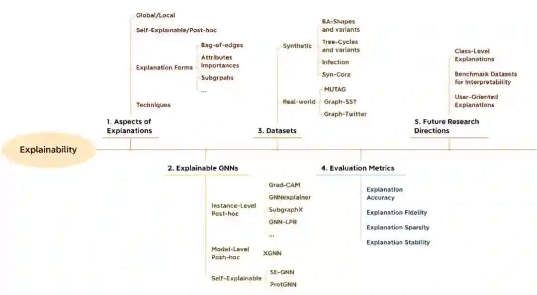 由于复杂图结构的离散型和高度的非线性,再加上 message-passing 机制在 GNNs 中的应用,图神经网络普遍缺乏可解释性。而开发可解释图神经网络(explainable GNNs)是十分关键的。因为提供的解释可以让参与者更信任图神经网络模型所做的预测。并且提供的解释可以用来了解模型所学到的知识,据此我们可以评估现有模型是否带有偏见或者已经被对抗攻击影响。 因此已经有一些工作开展了可解释 GNNs 的研究,我们在这里则对其进行了总结性回顾。对于可解释 GNNs 的讨论框架可见于图 4。其中我们首先对可解释性的应该考虑的各个方面进行了探讨。之后我们对已有的解释 GNNs 的方法分为 实例级事后(instance-level post-hoc),模型级事后(model-level post-hoc)以及自解释方法(self-explainable)。 值得强调的是,其中的 self-explainable GNNs 是一个未被讨论的新方向。因此我们详述了 self-explainable GNNs 如 SE-GNN [4] 和 ProtGNN [5] 的技术细节。对于其他种类的方法,我们根据其采用的方法进一步分为多个子类。由于在现实世界的图中很难获得可以作为检验标准的解释,因此数据集及其评估指标也是可解释性研究的一大挑战。虽然已有人造数据集以及部分现实数据集被应用,但是创造可解释性的基准数据集仍会一个重要的研究方向。更多内容详见我们的综述原文。