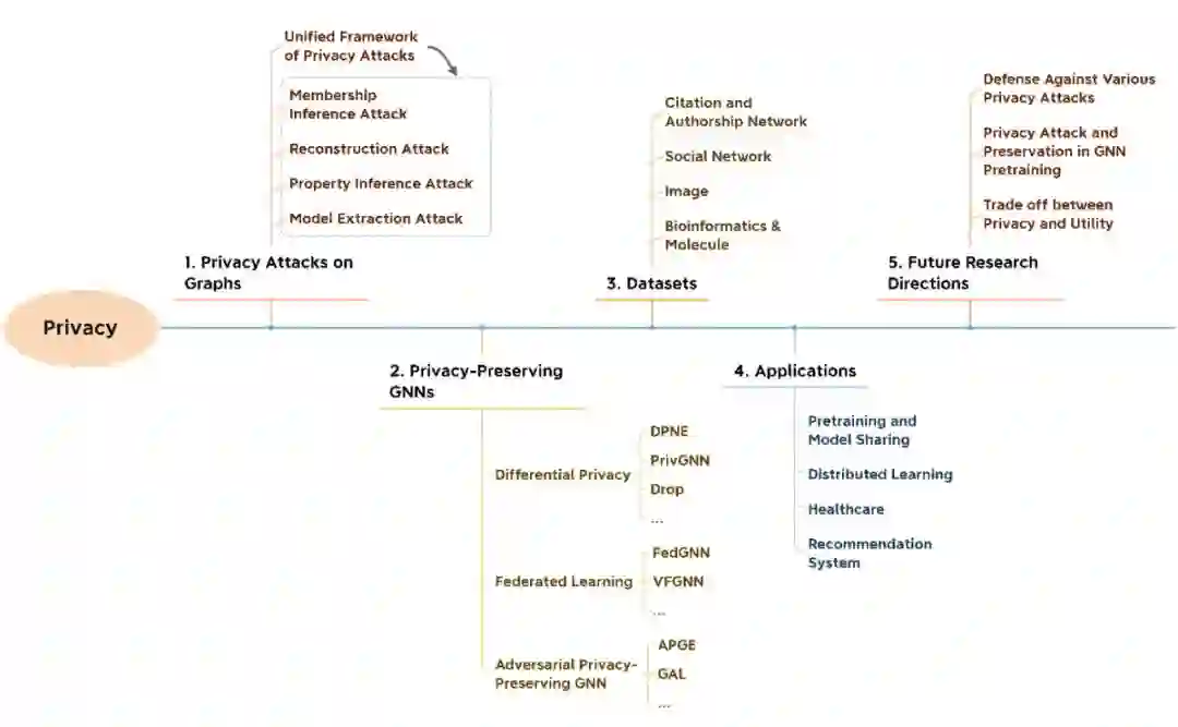 模型训练集中的隐私信息可能会在发布的模型或者提供的服务泄露。然而现有的综述论文多以讨论在图像和文本这类数据的隐私问题,其中讨论的方法难以拓展到图数据结构和采用 message-passing 架构的图神经网络。因此我们对隐私攻击(privacy attacks)以及图神经网络的隐私保护(privacy-preserving GNNs)进行了概述总结。囊括的概念和方法都列在图 1 之中。首先,我们对隐私攻击方法总结出了统一的框架。 然后,我们详细介绍了四种隐私攻击:Membership Inference Attack, Reconstruction Attack,Property Inference Attack 和 Model Extraction Attack。至于图神经网络的隐私保护,我们在综述中按照采用的方法将其归类为差分隐私(differential privacy),联邦学习(federated learning)和对抗隐私保护(adversarial privacy preserving)。 部分在文章讨论过得方法也列举在图 1 之中。对于更多的技术细节以及相关方法请见于综述论文第三章。这一章节还包含了不同领域的数据集以及图神经网络隐私保护的实际应用。同时我们发现对于一些类型的隐私攻击如 Property Inference Attack 及 Model Extraction Attack 现在都缺乏行之有效的防御办法。因此对于不同的隐私攻击的防御会是一个未来的研究方向。其他的未来研究方向也在文章中进行了讨论。更多细节请见原文。