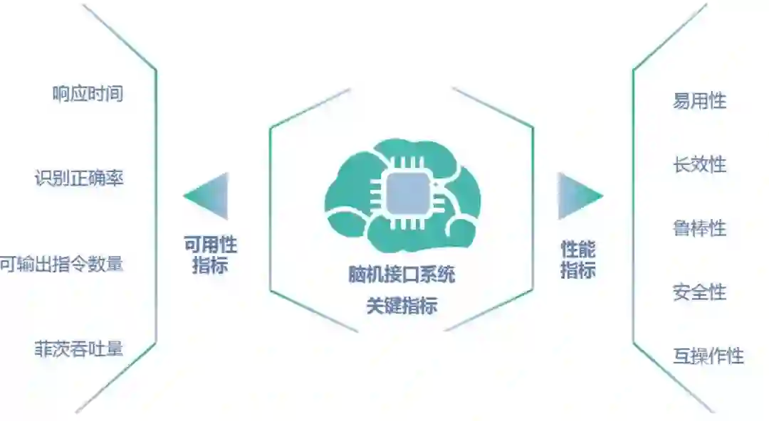 即脑机接口系统应具有准确的大脑意图解码算法;高效的信息解码效率,快速地反馈响应和执行任务;稳定的设备性能与抗干扰能力;易用、轻便、舒适的使用体验;安全和符合伦理要求的植入、采集和信息传送保障。是否满足五大需求的评判指标,可分为性能指标与可用性指标两组。性能指标主要体现在响应时间、识别正确率、可输出指令数量和菲茨吞吐量等4个易量化指标;可用性指标主要体现在易用性、长效性、鲁棒性、安全性和互操作性等五个主客观结合指标。
