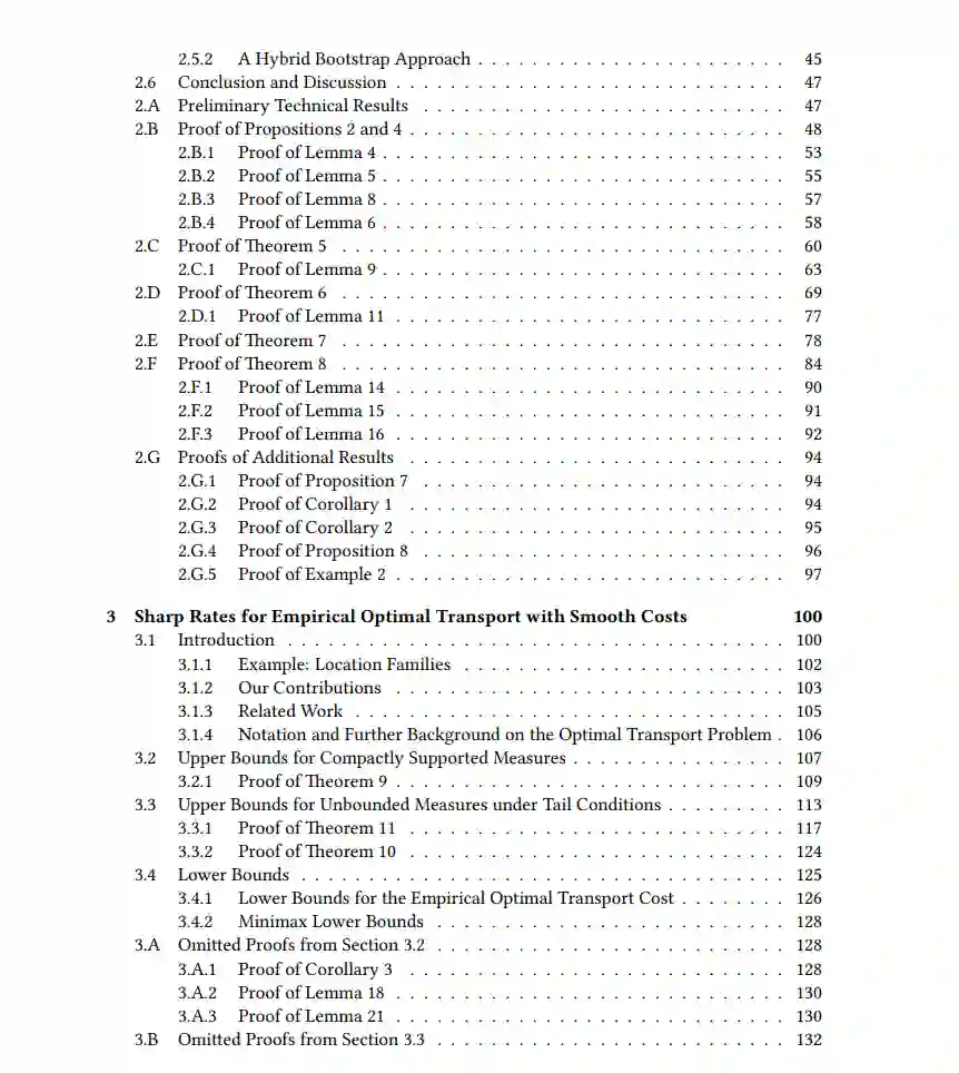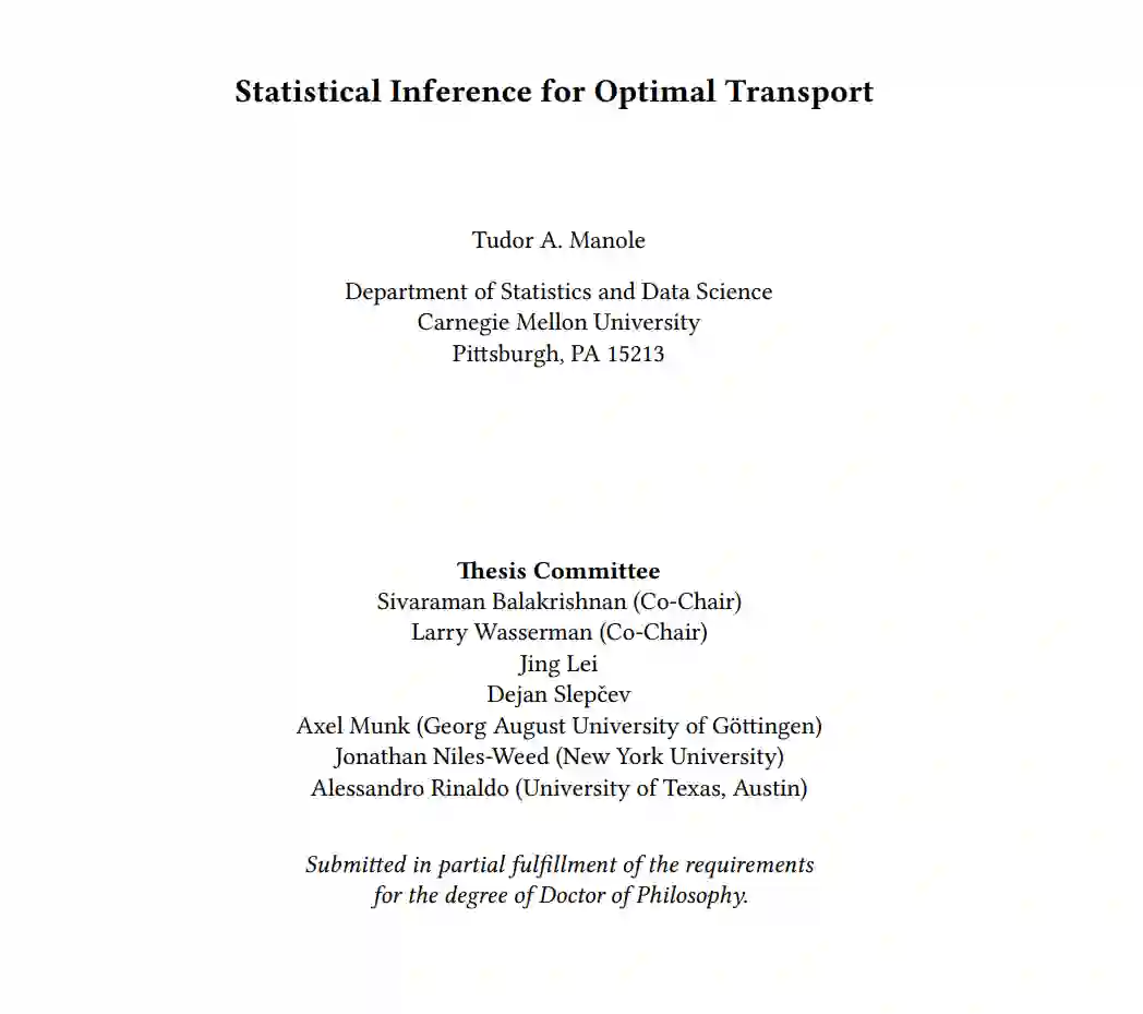 最佳传输是一个用于比较概率分布的灵活框架,最近作为统计学中的方法工具引起了广泛关注。本论文的目的是开发在最佳传输框架下对各种对象进行有效和高效统计推断的程序。一方面,我们推导出一个在任意固定维度下概率测度之间的二次Wasserstein距离的半参数高效估计量。另一方面,我们为多变量周期性分布之间的二次最佳传输映射开发了逐点中心极限定理。 此外,我们还开发了针对各种最佳传输散度函数的非渐近和序贯推断程序。这些结果为在任意维度上进行实际最佳传输推断这一长期存在的问题提供了一步解决途径。在此过程中,本论文研究了相关的最优传输映射和成本的极小极大估计问题,从而在各种情况下得出了这些问题的新极小极大上界或下界。 最后,我们将这些思想应用于实验高能物理中出现的一个问题,展示了最佳传输可以用于解决在大型强子对撞机中寻找新物理现象时产生的数据驱动背景估计问题。