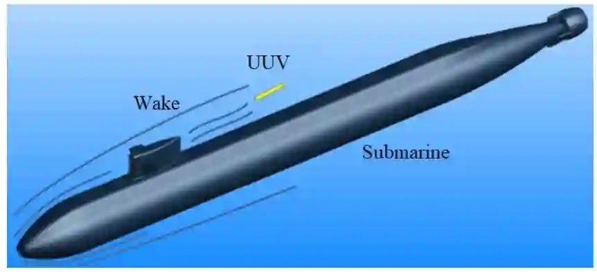 图 1-1: 演示潜艇对水流的影响。由于 UUV 靠近潜艇运行,这种尾流和流场会影响 UUV 的运行。