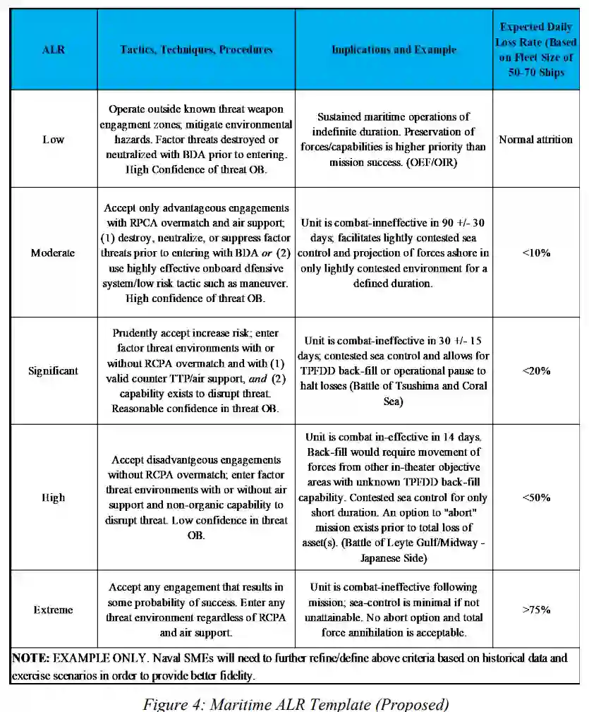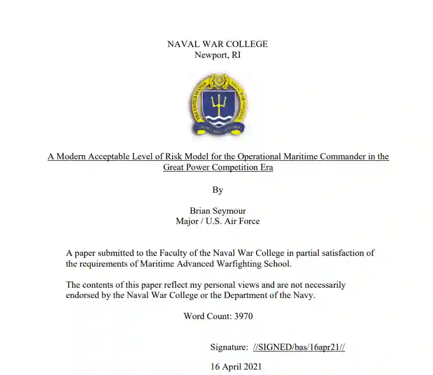 为了有效面对大国时代的同行竞争者,美国海军将需要一个现代化的风险评估模型,以有效完成海上目标,支持联合部队在高端战斗中实现作战和战略目标。将目前的风险评估过程中识别危险、确定频率和影响的工作现代化,使之成为一个更广泛的可接受的风险水平(ALR)结构,就像美国空军那样,将使指挥官能够更好地传达风险接受水平和舰队使用的分布式海上行动(DMO)模式中的意图。此外,战术级指挥官在DMO概念下执行任务指挥时,将更好地理解战术级风险接受的界限或限度。