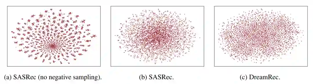 下面是用T-SNE对不同模型的物品向量表示进行降维可视化的结果。可以看出SASRec如果不进行负采样,学到的物品将难以区分;SASRec进行负采样后,可以更好的区分不同物品,但在中心区域仍有难以区分的物品。而DreamRec在不依赖负采样的情况下,对物品空间进行了更加全面的探索。