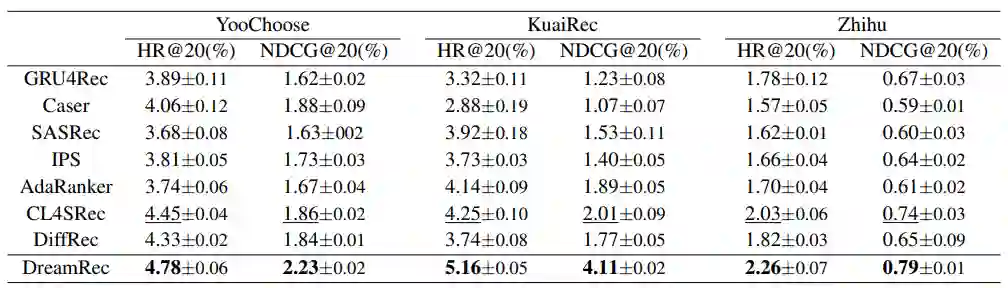 我们在三个真实数据集下,与代表性的序列推荐方法进行对比,展示了DreamRec优秀的推荐性能。值得注意的是,DreamRec作为生成式推荐模型,完全不依赖负采样,而其余序列推荐模型均为判别式,对负采样具有极强的依赖。