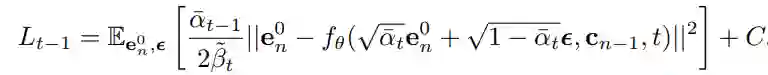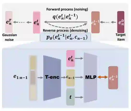 注意此分布并非给定交互序列后,预测对候选集种物品推荐的概率分布,这是基于判别式推荐系统的常见建模方式。此分布描绘了给定交互序列后,生成理想物品需要服从的分布。如果此分布可以准确建模,那么我们将可以从中直接采样出理想物品。在DreamRec中,此分布通过条件扩散模型进行学习。