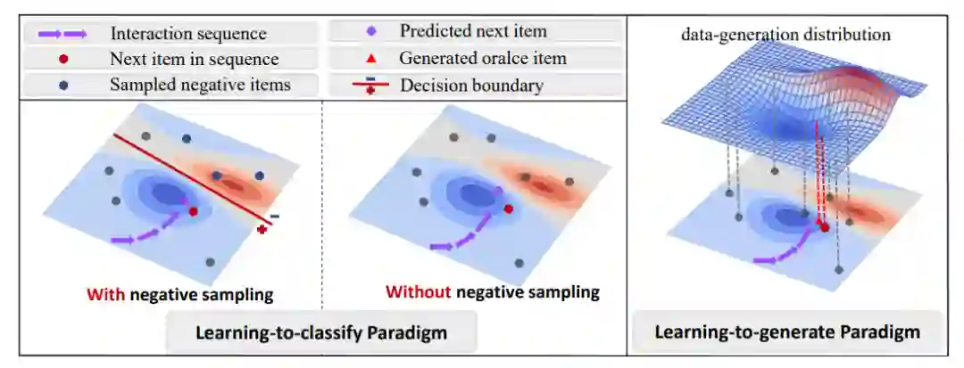 长久以来,推荐任务被视为判别式任务(Learning to Classify):给定用户的交互历史,基于判别式的传统推荐模型通过优化正样本(观察到的用户交互)和负样本(通常通过负采样得到)的判别边界,来实现推荐模型的训练。
