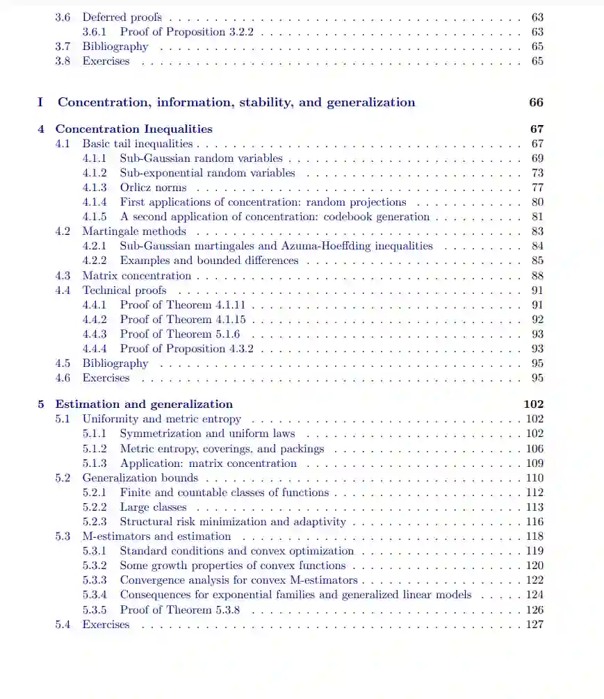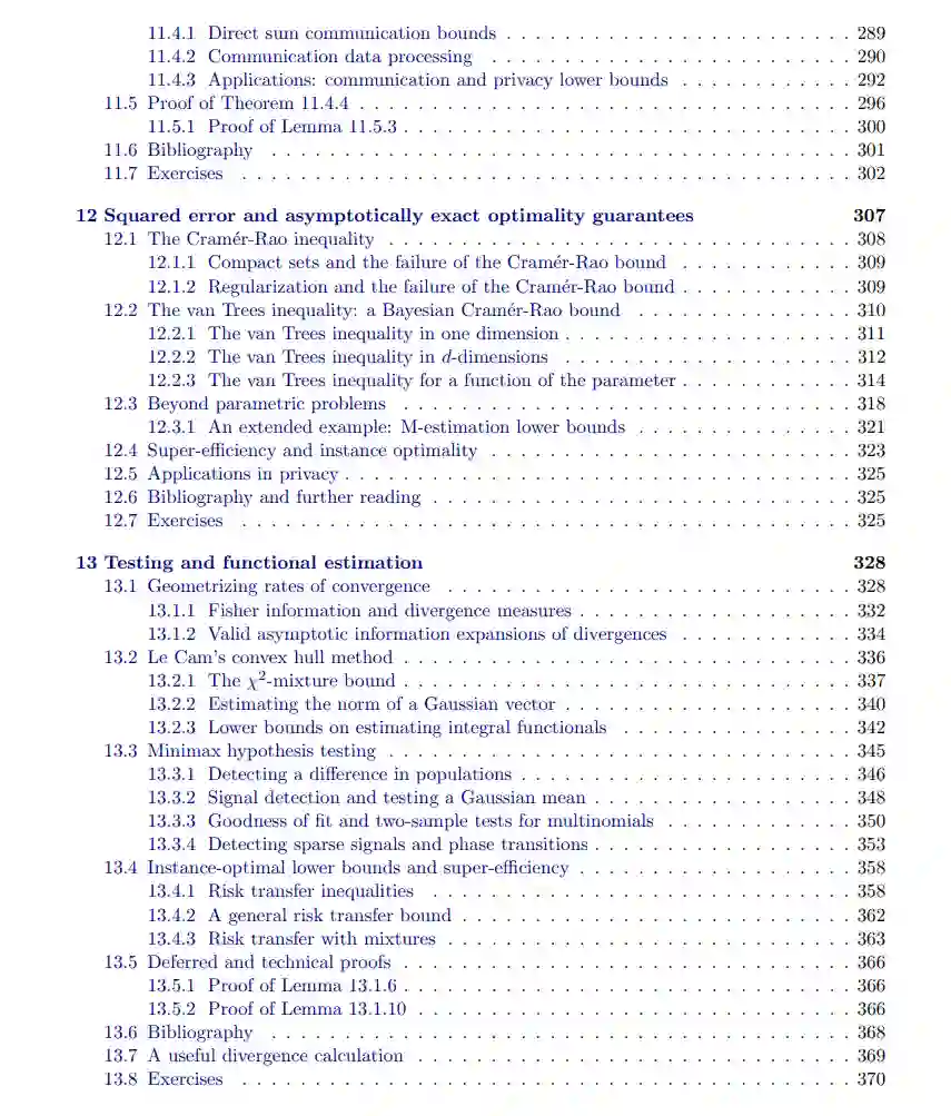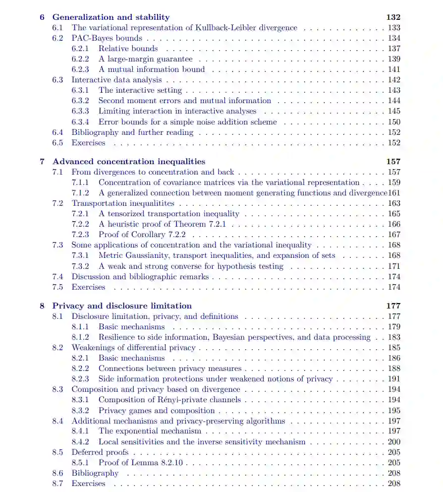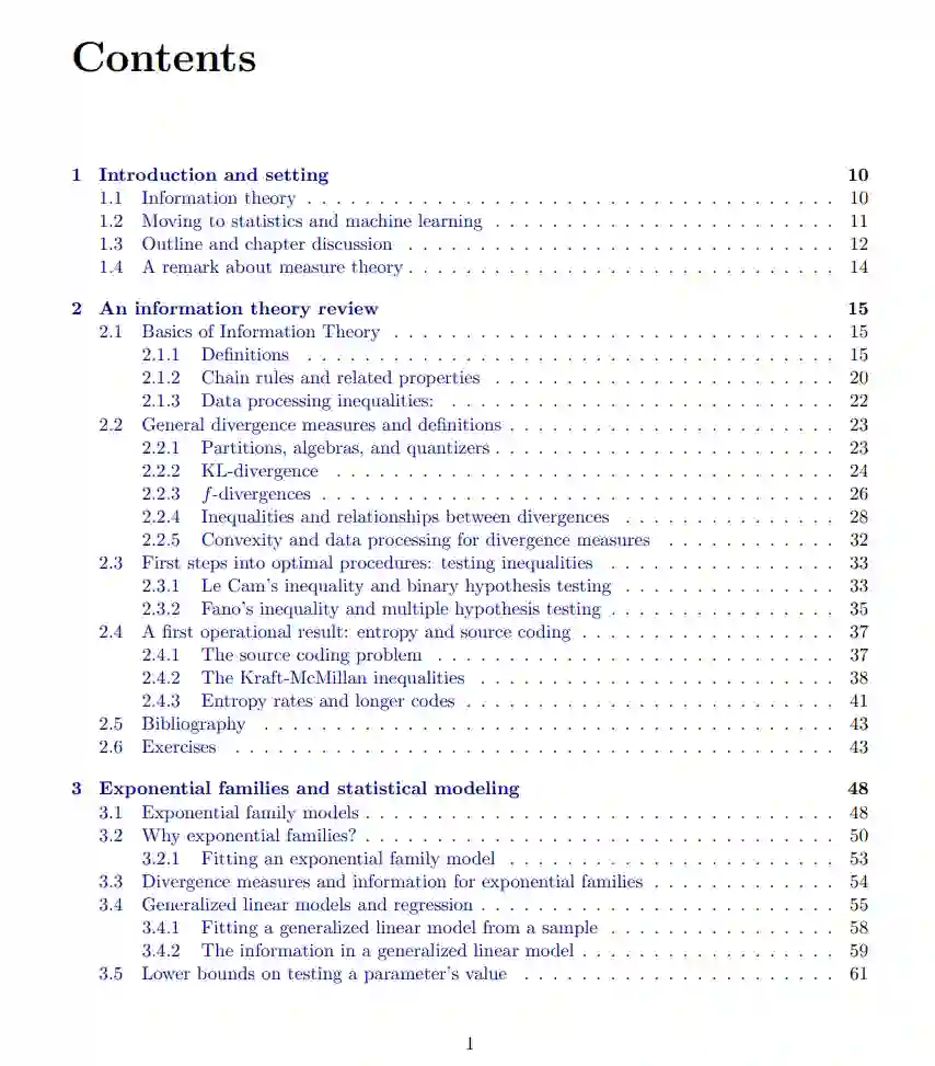 **本书探讨了信息论、统计学、计算与学习之间的若干(众多)联系。信号处理、机器学习和统计学都围绕着从信号和数据中提取有用信息展开。**在信号处理和信息论中,一个核心问题是如何设计信号——以及它们传输的通道——以最大限度地传达和存储信息,并允许最有效的解码。与此不同,在机器学习和统计学中,通常情况下自然界提供了一个固定的数据分布,学习者或统计学家的目标是恢复关于这个(未知的)分布的信息。我们的目标是展示信息论的视角如何提供清晰的答案和技术来实现这一恢复过程。信息论的核心内容之一是发现基本极限:发展出证明某些程序是最优的结果。 因此,信息论工具能够描述在各种通信和统计情境下可达成的结果。正如我们将在接下来的章节中探讨的那样,在统计推断和机器学习任务的背景下,这使我们能够开发出能够证明最优性的程序——即没有比这更好的程序。这类结果在许多方面都非常有用:我们希望避免做出错误的决策或错误的推断,可能会意识到某些任务是不可完成的,此外,我们还可以明确计算解决不同统计问题所需的数据量。我将本书分为四个独立的部分,每一部分当然与其他部分相互关联,但每一部分也可以作为一个相对自包含的单元进行阅读。 本书以第二章的回顾开始,介绍了我们讨论的基本信息论量:互信息、熵和散度度量。这是后续所有章节的必读内容。第三章提供了指数族模型的概述,这是统计学习工具箱中的核心工具。熟悉这部分内容的读者,可能通过广义线性模型的课程学习过,可以跳过这部分,但它为后续章节中的例子和应用提供了有用的基础,因此我们将在全书中多次回到这一部分。本书的第一部分涵盖了我所称的“稳定性”结果。 从高层次来看,这意味着我们探讨在序列中的每个随机变量观察值对该序列的各种函数影响较小的情况下,可以获得哪些成果。我们从第四章的集中不等式开始,讨论和求和以及相关量如何快速收敛;尽管这部分内容对后续章节至关重要,但它不依赖于特定的信息论技术。我们在本书的这一部分中讨论了一些启发式应用,涉及统计学习中的问题——经验风险最小化,第五章提供了关于均匀集中性的一些结果,并将其应用于“泛化”——机器学习中的标准理论工具,通常应用于预测模型的准确性——以及估计问题,这些为模型参数估计提供了各种保证,是核心的统计问题和技术。接着我们在第六章中深入探讨泛化和收敛保证——通过控制不同的信息论量,证明样本X1,…,XnX_1, \dots, X_nX1,…,Xn 的函数代表了从中抽取样本的完整总体PPP。在这个背景下,我们发展了PAC-Bayesian界限,并使用相同的框架提供了控制泛化和收敛的工具,应用于交互式数据分析。这类分析反映了现代统计学,在这种分析中,我们在进行更全面的分析之前,先进行某种数据探索,但它打破了经典统计方法,因为这种分析依赖于样本。我们在第七章中讨论了更高级的想法,发展了关于随机矩阵的更复杂的集中结果,利用信息论的核心思想,将散度度量与不同的随机过程连接起来。最后,第八章探讨了披露限制和隐私技术,这些技术都基于分布中的不同稳定性概念。第二部分研究了基本极限,使用信息论技术推导各种估计、学习和其他统计问题的收敛速率下界。 第九章首先介绍了三种主要的下界方法:Assouad方法、Fano方法和Le Cam方法。这一章展示了所有其他下界方法的基本技术。从高层次来看,我们可以将这一部分与第一部分一起看作是本书的整体研究目标:分布如何彼此接近,我们如何利用这种接近性?第十章简要介绍了一些超出这些方法的下界技术,包括一些非参数问题的应用,以及一些超越典型期望值下界的结果,这些结果模拟了信息论中的“强对偶定理”,即以极高的概率,不能期望取得比平均误差更好的结果。在现代统计学习问题中,人们常常关注的不仅仅是统计风险,还包括通信或计算成本,或者研究参与者的隐私。因此,在第十一章中,我们开发了一些近期针对这些问题的技术,特别是涉及我们希望同时获得多维度最优保证的问题,这与信息论中的通信复杂度思想相关。第十二章回顾了最常见的误差度量——平方误差,介绍了经典统计工具,但也展示了一些这些思想的现代应用,它们在一些问题中重新出现。最后,我们通过第十三章探讨了测试问题和函数估计,研究那些只希望估计大模型中的一个单一参数的情况。尽管估计单一标量似乎比其他问题简单,但充分解决其复杂性需要相当细致的处理,并引入信息论工具。第三部分重新审视了我们在第二章中提出的所有信息论概念,但不再仅仅给出定义和一些推论,而是提供了不同信息论量(如熵)的操作性解释。 当然,这包括了香农关于编码和熵关系的原始结果(我们在第二章的概述2.4.1节中讨论信息论时涉及),同时我们也提供了熵和信息作为统计实验和统计学习中不确定性度量的解释,这在信息论对熵的处理当中通常缺失(第十四章)。我们的讨论揭示了熵与用于预测的损失函数之间的深刻联系,通过一种特定的对偶性,使得我们可以在两者之间来回转换。我们在第十五章将这些想法与校准问题联系起来,探讨如何确保预测模型的有效性,例如,在75%的日子里,如果模型预测降雨概率为75%,则确实会下雨。我们还利用这些信息论中的风险、熵和损失的概念,联系