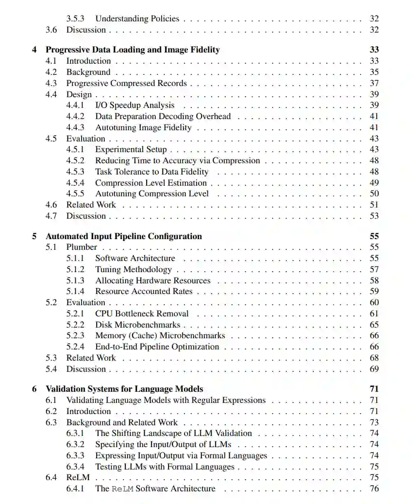机器学习领域,特别是深度学习,由于算法、计算能力和数据集的改进,近年来取得了巨大进步。为支持深度学习而构建的系统主要针对用于生成学习模型的计算。 本论文提出改为关注数据在训练和验证中的作用。在论文的第一部分,我们关注训练数据,展示了负责训练数据的数据管道是性能考虑的首要目标。为了解决性能问题,我们引入了一种在数据转换空间中进行数据子采样的方式,一种降低精度的输入/输出格式,以及一个自动调整数据管道性能参数的系统。在论文的第二部分,由于日益增长和表达能力增强的模型的趋势,我们转向验证环境,开发了一个系统,可以使用标准正则表达式自动查询和验证大型语言模型的行为。我们以机器学习的数据系统领域的未来工作作为结论。在过去的十年里,机器学习(ML)在应用方面经历了迅猛的增长。这个领域关注的是随着数据或经验而改进的算法[201],已经从一系列专业化的应用(例如,广告[195],推荐系统[60, 106, 213],垃圾邮件检测[316])演变为应用于几乎所有技术领域。例如,深度学习应用于游戏玩法[261, 286],蛋白质折叠[143],机器人学[80],一系列自然语言处理任务[43, 55],并且预计将达到一种无处不在的程度,可能导致重大的经济颠覆[87]。在这场革命的最前沿是深度学习子领域[108, 173]。深度学习使用多层结构 - 数学操作 - 来构建模型。这些层被联合学习,以便早期层简化后续层面临的任务。虽然深度网络在理论上可能不如其他机器学习或人工智能方法那么被理解,但它们已经表明,尽管在计算上开销巨大但通用的方法最终会主导利用额外专业化的算法[268]。这种在计算上开销巨大但通用的方法已经受益于像摩尔定律[209]这样的趋势 - 硬件性能的指数级增长 - 以及硬件和软件的专业化[165, 275]。如今众多的深度学习软件使深度学习或许比其他替代方案更易于获取 - 只需获得通常是开源且随时可用的模型规范代码,就可以训练最先进的模型。深度学习技术的核心已经被商品化和民主化,使任何人都可以受益于人类多年的研究和开发。