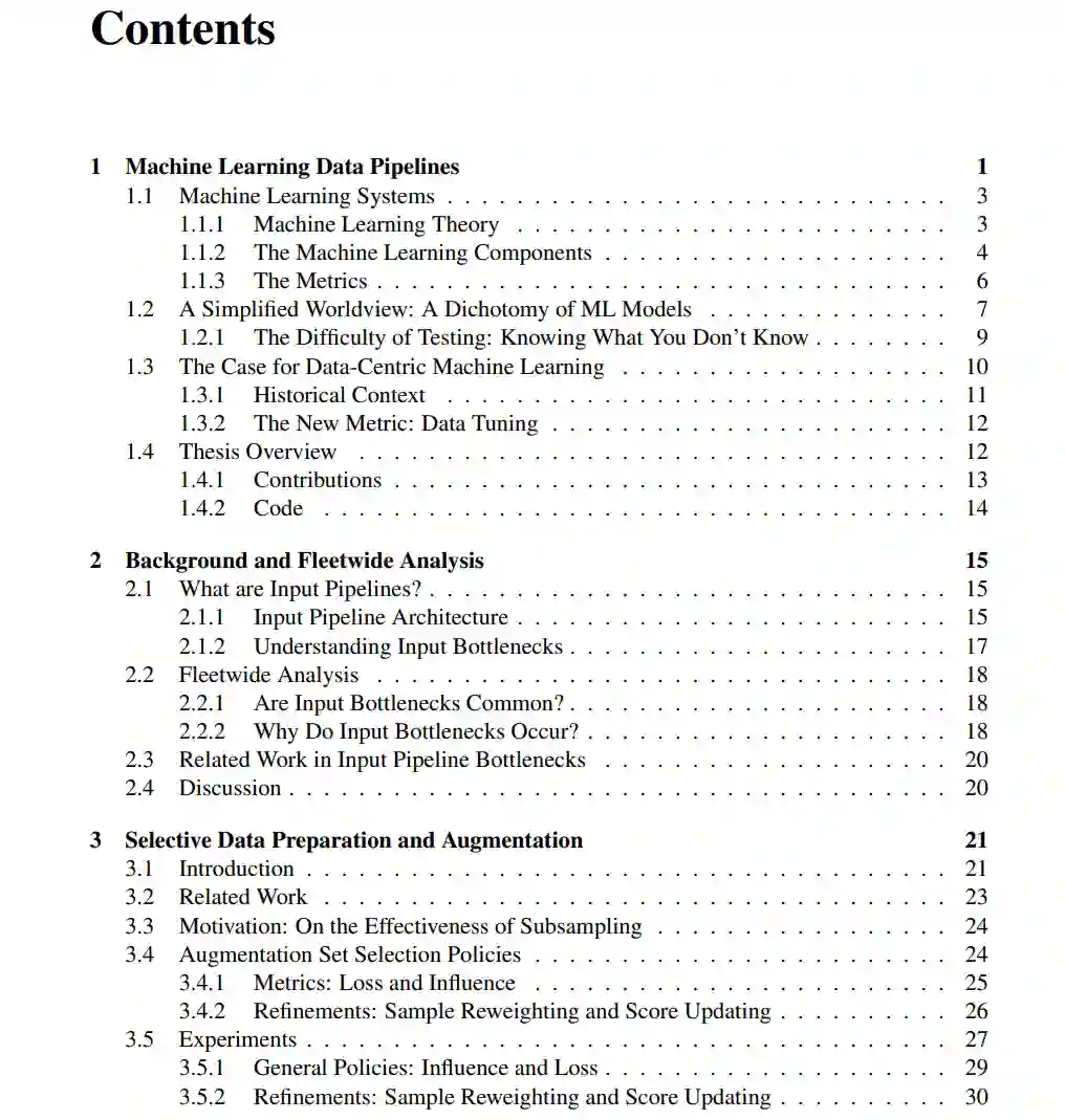 作为这篇论文的一部分,我们探讨了现代机器学习技术栈中新功能或修订功能的几个方向,重点关注整个技术栈中数据的处理。研究数据很重要,因为在三个问题领域中,数据是最具动态性的 — 数据总是可以进一步优化以涵盖更多样本、更多特征或某些类型的行为,而模型(和计算)在处理某种类型的数据时必然是固定的。此外,对数据的优化可能导致应用程序的显著增益,从而刺激数据为中心的AI研究[3]。然而,这并非轻而易举,改变数据容易说难做。由于缺乏理论理解,对于任何新类型的机器学习任务,从业者可能必须测试哪种数据组合效果最好。如果没有适当的数据抽象,任务中的单一变化可能导致从业者必须手动评估和调整应用程序数据的特征。调整数据的方面不仅是单调乏味的,而且根据数据评估模型以及系统性能的行为需要机器学习和系统的专业知识,而这些专业知识通常是由不同群体的人拥有的。如果机器学习系统的目标是支持从业者解决重复问题,那么可以合理地期望机器学习系统能够使数据的快速配置和原型制作成为可能。简而言之,数据管道应该是机器学习系统栈中的一等公民 - 它们不应该是作为附加工具支持模型和计算的事后考虑。本章其余部分的组织结构如下。首先,我们概述机器学习系统是如何构建和评估的(§1.1)。然后,我们概述机器学习中的工作负载是如何发生根本性变化的,这使得社区分裂成两个部分(§1.2),并激励对机器学习系统进行根本不同的处理。然后我们转向论文的动机,重新审视数据在当前机器学习环境中的重要性(§1.3)。最后,我们介绍论文陈述并概述本文的章节(§1.4)。熟悉当前机器学习和机器学习系统状态的读者可以跳过第1.1节和第1.2节的“教科书材料”,并直接前往第1.3节。