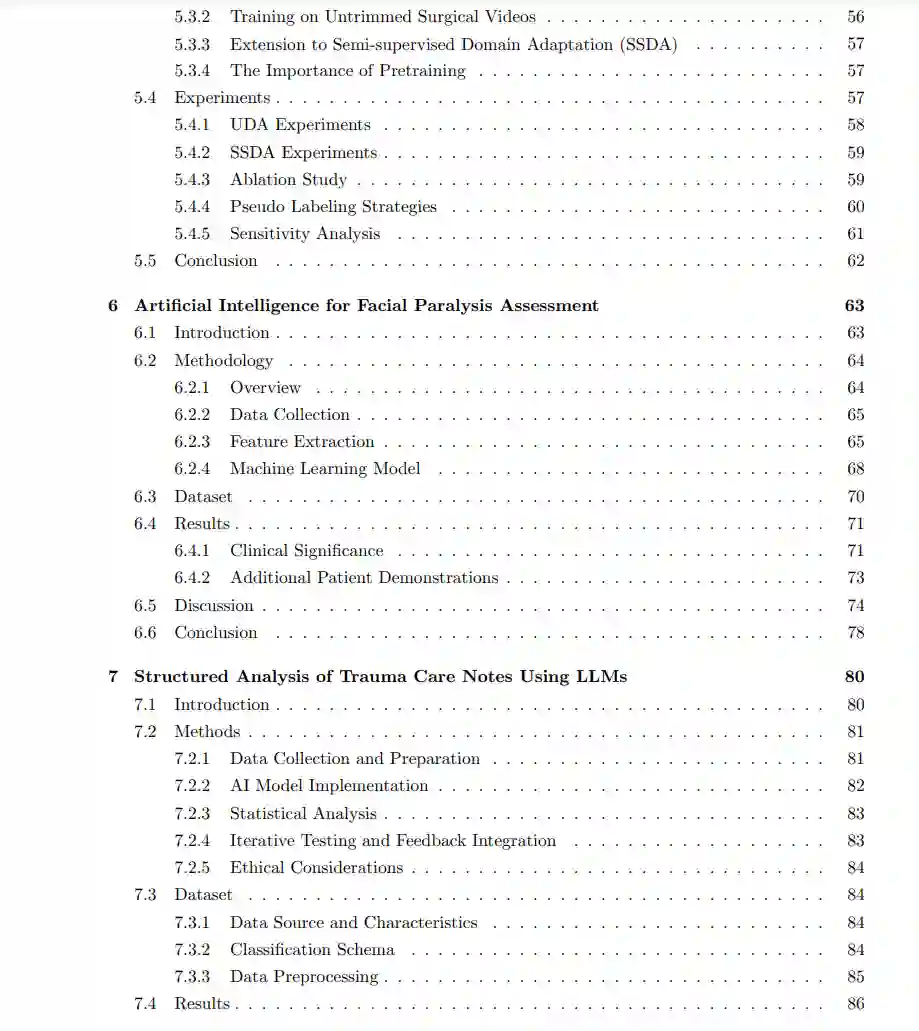 本论文的最后一个主题探讨了通过预训练基础模型提升鲁棒性和效率的需求。随着AI模型变得越来越复杂,能够重用和自适应预训练模型以完成特定任务变得愈发重要。这一方法不仅提高了AI系统的鲁棒性,还减少了训练所需的计算资源和数据资源。 该主题通过开发基于视频的面瘫评估人工智能系统得到了体现。面瘫是一种严重影响患者生活质量的疾病,准确评估对于有效治疗至关重要。该工作利用预训练模型来分析患者视频,提供客观和标准化的面瘫评估。通过使用预训练组件,该系统能够在有限的数据下进行准确评估,展示了基础模型在临床应用中的强大能力。