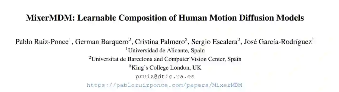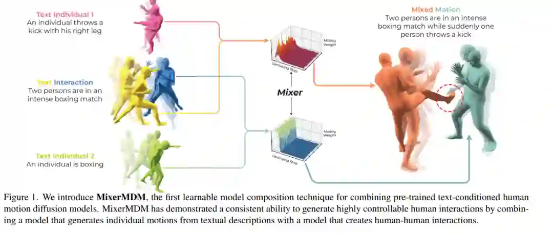 生成由条件(如文本描述)指导的人体运动是一项具有挑战性的任务,因为它需要具有高质量运动及其对应条件的配对数据集。当目标是实现更精细的生成控制时,困难会进一步增加。为此,先前的工作提出了结合多个在不同条件数据集上预训练的运动扩散模型,从而实现对多个条件的控制。然而,现有的合并策略忽视了生成过程的最佳组合方式可能依赖于每个预训练生成模型的特性以及具体的文本描述。在这种背景下,我们提出了 MixerMDM,这是第一个可学习的模型组合技术,用于结合预训练的文本条件人体运动扩散模型。与先前的方法不同,MixerMDM 提供了一种动态混合策略,该策略通过对抗训练的方式学习根据驱动生成的条件集来结合每个模型的去噪过程。通过使用 MixerMDM 结合单人和多人运动扩散模型,我们能够对每个人的动态进行精细控制,并且也能控制整体的交互过程。此外,我们提出了一种新的评估技术,首次在该任务中通过计算混合生成运动与其条件之间的对齐程度,来衡量交互性和个体质量,并评估 MixerMDM 在去噪过程中根据要混合的运动调整混合的能力。