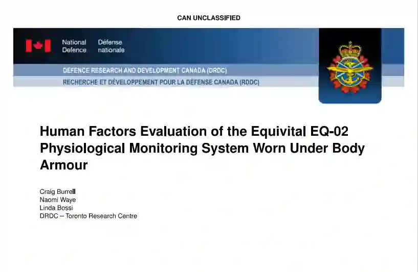 本文对可穿戴生理监测器Equivital EQ-02 LifeMonitor进行了人为因素评估,该监测器由一个胸带和一个小型电子模块组成,能够监测心率、呼吸、身体加速度和皮肤温度。28名男性参与者在五天的真实军事训练活动中穿戴监测器,包括完成移动课程、行进和分段攻击。