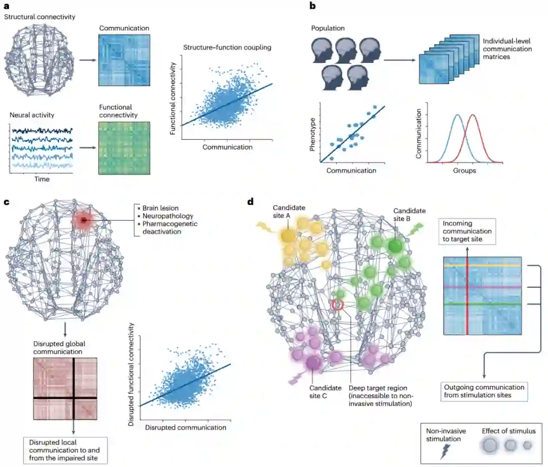 Medaglia, J. D., Lynall, M.-E. & Bassett, D. S. Cognitive network neuroscience. J. Cogn. Neurosci. 27, 1471–1491 (2015). 1. Smith, S. M. et al. A positive–negative mode of population covariation links brain connectivity, demographics and behavior. Nat. Neurosci. 18, 1565–1567 (2015). 1. Fornito, A., Zalesky, A. & Breakspear, M. Graph analysis of the human connectome: promise, progress, and pitfalls. NeuroImage 80, 426–444 (2013). 1. Popp, J. L. et al. Structural–functional brain network coupling predicts human cognitive ability. Preprint at bioRxiv https://doi.org/10.1101/2023.02.09.527639 (2023). 1. Zorlu, N. et al. Abnormal structural network communication reflects cognitive deficits in schizophrenia. Brain Topogr. 36, 294–304 (2023). 1. Imms, P. et al. The structural connectome in traumatic brain injury: a meta-analysis of graph metrics. Neurosci. Biobehav. Rev. 99, 128–137 (2019) 1. Imms, P. et al. Exploring personalized structural connectomics for moderate to severe traumatic brain injury. Netw. Neurosci. 7, 160–183 (2023). 1. Kuceyeski, A. et al. The application of a mathematical model linking structural and functional connectomes in severe brain injury. NeuroImage Clin. 11, 635–647 (2016). 1. Kuceyeski, A. F., Jamison, K. W., Owen, J. P., Raj, A. & Mukherjee, P. Longitudinal increases in structural connectome segregation and functional connectome integration are associated with better recovery after mild TBI. Hum. Brain Mapp. 40, 4441–4456 (2019). 1. Albert, R., Jeong, H. & Barabasi, A. L. Error and attack tolerance of complex networks. Nature 406, 378–382 (2000). 1. Palop, J. J. & Mucke, L. Amyloid-beta-induced neuronal dysfunction in Alzheimer’s disease: from synapses toward neural networks. Nat. Neurosci. 13, 812–818 (2010). 1. Raj, A., Kuceyeski, A. & Weiner, M. A network difusion model of disease progression in dementia. Neuron 73, 1204–1215 (2012). 1. Meier, J. M. et al. Connectome-based propagation model in amyotrophic lateral sclerosis. Ann. Neurol. 87, 725–738 (2020). 1. Vogel, J. W. et al. Spread of pathological tau proteins through communicating neurons in human Alzheimer’s disease. Nat. Commun. 11, 2612 (2020). 1. Zheng, Y.-Q. et al. Local vulnerability and global connectivity jointly shape neurodegenerative disease propagation. PLoS Biol. 17, e3000495 (2019). 1. Wannan, C. M. J. et al. Evidence for network-based cortical thickness reductions in schizophrenia. Am. J. Psychiatry 176, 552–563 (2019). 1. Shafiei, G. et al. Spatial patterning of tissue volume loss in schizophrenia reflects brain network architecture. Biol. Psychiatry 87, 727–735 (2020). 1. Miller, K. L. et al. Multimodal population brain imaging in the UK Biobank prospective epidemiological study. Nat. Neurosci. 19, 1523–1536 (2016). 1. Sina Mansour, L., Di Biase, M. A., Smith, R. E., Zalesky, A. & Seguin, C. Connectomes for 40,000 UK Biobank participants: a multi-modal, multi-scale brain network resource. Preprint at bioRxiv https://doi.org/10.1101/2023.03.10.532036 (2023). 1. Keller, C. J. et al. Mapping human brain networks with cortico-cortical evoked potentials. Philos. Trans. R. Soc. Lond. B Biol. Sci. 369, 20130528 (2014). 1. Sydnor, V. J. et al. Cortical–subcortical structural connections support transcranial magnetic stimulation engagement of the amygdala. Sci. Adv. 8, eabn5803 (2022). 1. Ozdemir, R. A. et al. Individualized perturbation of the human connectome reveals reproducible biomarkers of network dynamics relevant to cognition. Proc. Natl Acad. Sci. USA 117, 8115–8125 (2020). 1. Veit, M. J. et al. Temporal order of signal propagation within and across intrinsic brain networks. Proc. Natl Acad. Sci. USA 118, e2105031118 (2021). 1. Seguin, C. et al. Communication dynamics in the human connectome shape the cortex-wide propagation of direct electrical stimulation. Neuron 111, 1391–1401.e5 (2023). The first paper to show that network communication models can predict the propagation of direct electrical stimulation through the human brain.