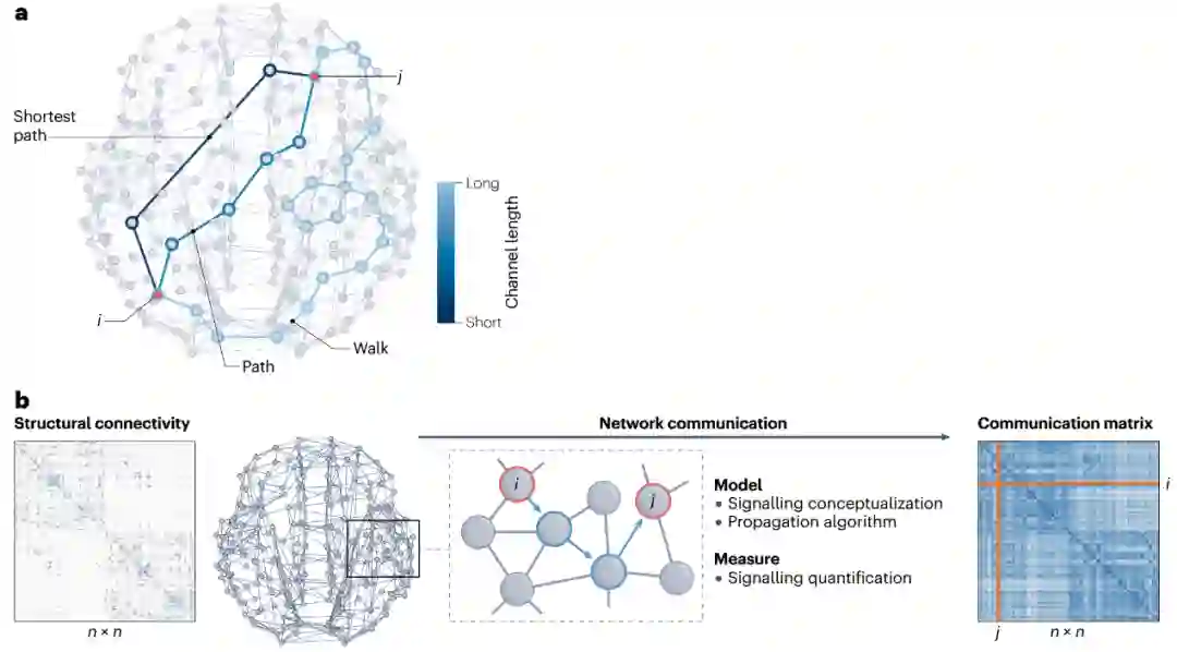人类连接组是由灰质区域(网络节点)与白质束(网络连边)相互连接而成的宏观连接网络。通过复杂的大脑连通性进行多突触信号传播的指导原则是什么?通路和路径是图论中的概念,描述穿越网络的方式。通路被定义为一个连接序列,其中连续的一对连边共享同一节点。通路对节点和连边的遍历次数没有限制,是最无约束的网络遍历方式。在路径中,单个节点、连边只能经过一次,不允许信号重访网络元素。a. 区域i和j间有许多可能的通信通道,这些通道长度各不相同,表示它们支持快速且可靠信号传递的能力,最短路径是两区域间最高效的通道。b. 网络通信模型。结构连接矩阵表示n个神经元之间的物理连接,它只编码直接连接的节点间的信息,因此通常是稀疏矩阵。通信模型描述通过结构连接引导信号传播的策略,该模型确定了从节点i到j的路径(蓝色箭头)。通信测量方法量化该模型确定的路径的特征(例如效率、成本和弹性),从而得出从i到j的信号过程被推测会存在的特征。网络通信模型和度量可以在无向(双边连接)或有向(非对称连接)以及无权重(仅表示存在或不存在连接)或有权重(表示连接强度)的结构网络中计算。对于某些模型,连接权重需要转化为连接长度,以反映穿越连接的成本[15]。本综述中描述的大多数模型和测量方法的实现均可在“脑连接工具箱”(Brain Connectivity Toolbox)中找到[36]。b部分经授权改编自参考文献126,Elsevier。