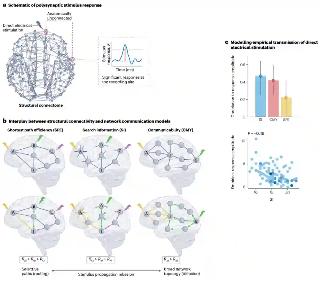 图4 网络通信模型的可解释性洞察力:脑刺激案例研究。a,通过局灶直接电刺激发出的脉冲在远处解剖学上未连接的部位引起皮质-皮质诱发反应。b,网络通信测量根据白质连接的不同特征量化通过连接组发出的信号。比较不同测量方法对刺激诱发反应强度(R)差异的解释程度,可以深入了解神经通讯动态。从节点A、B和C到目标节点T的最短路径长度(左图)完全基于它们之间最直接路径的连接。根据最短路径模型,刺激A、B和C所引起的反应应该是RAT > RBT > RCT。搜索信息(中心)与无偏随机游走从源节点沿最短路径到达目标节点的概率有关,该概率值由构成路径的节点的局部连接性决定。因此,搜索信息不仅对网络的最短路径结构敏感,而且对局部拓扑特征也很敏感。在脑刺激方面,搜索信息可以解释为刺激和目标点间的刺激分散倾向。尽管A、B和C到T的最短路径长度相同,但搜索信息预测RCT > RBT > RAT。可传播性(右图)考虑了通过所有网络路径进行的广播,它表示节点可以通过多条可选路径进行通信的程度,短路径比长路径贡献更大。尽管A和B到T的最短路径长度相同,但由于A到T的短路径更多,因此可沟通性预测RAT > RBT。c,网络通信测量与直接电刺激后经验观察到的反应幅度之间的相关性。诱发反应是根据解剖学上未连接部位间的颅内脑电图记录进行有创推断的。与最短路径效率相比,搜索信息和可交流性更能解释刺激传播的差异,从而让人们深入了解白质连通性的哪些特征决定了人脑中的多突触交流。图自参考文献116,Elsevier。