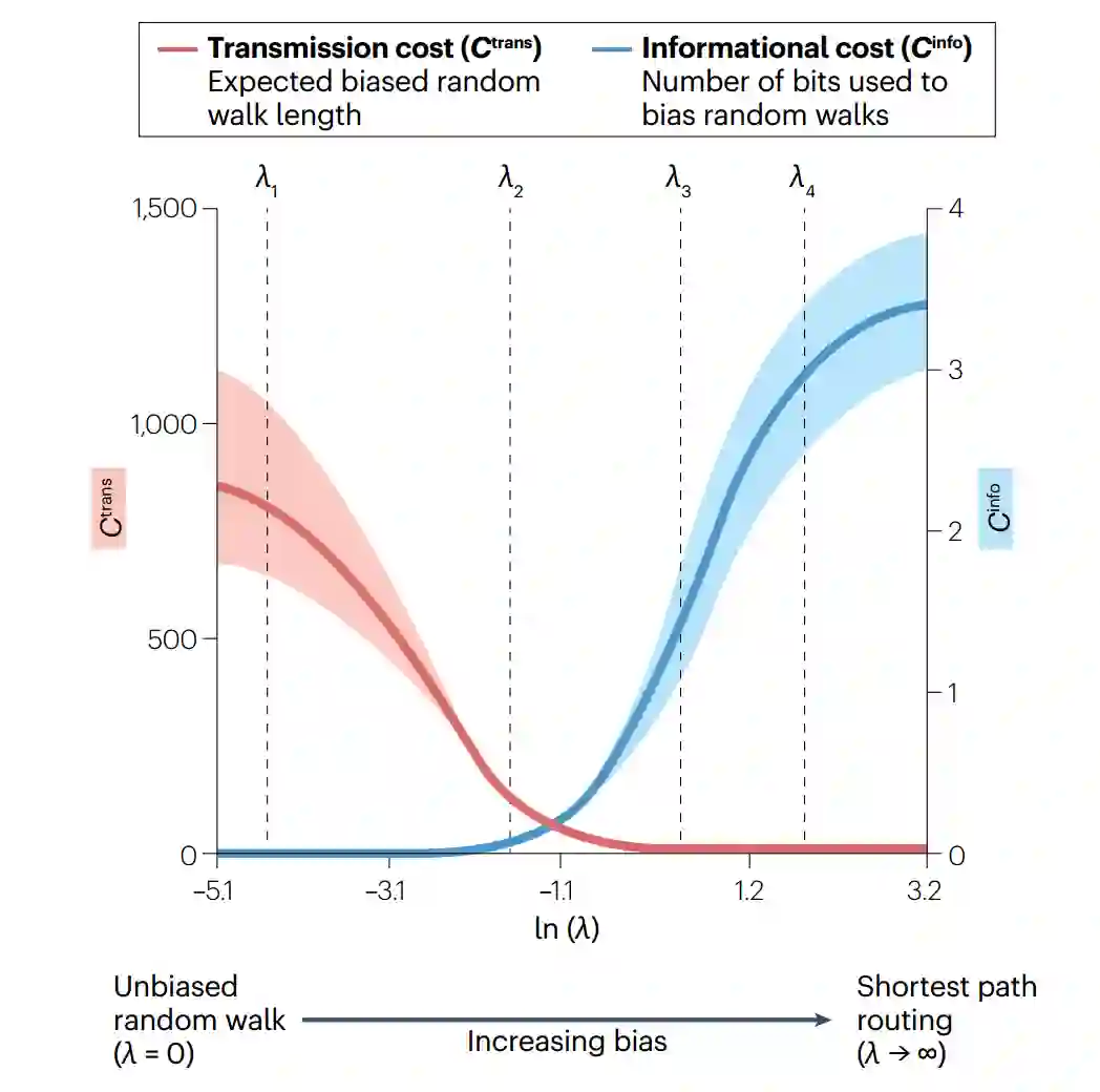 有偏随机游走会产生连续的传播策略谱,从而对延迟和信息成本之间的权衡进行定量分析。直观而言,经验性的连接组分析表明,增加λ(节点可用的全局信息量)会导致平均信息成本单调增加与节点对间平均传输延迟减少[62](见图)。但重要的是,两种成本的变化率并不相同,λ值范围较窄时,信息成本和延迟成本变化率都较低,这表明,连接组拓扑结构可能是这样组织的:引入微妙的偏差因素可能会在通信效率方面带来不成比例的巨大收益。