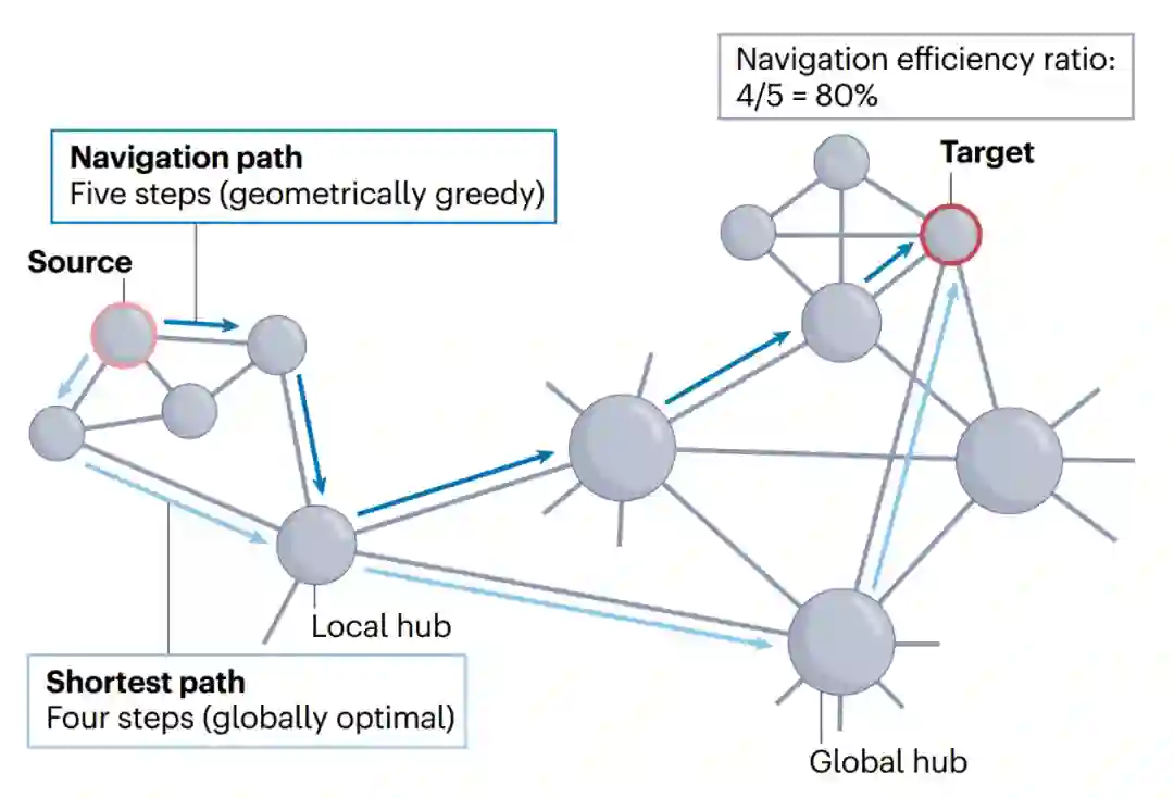 Kleinberg, J. M. Navigation in a small world. Nature 406, 845 (2000). 1. Boguna, M., Krioukov, D. & Clafy, K. C. Navigability of complex networks. Nat. Phys. 5, 74–80 (2009). 1. Goñi, J. et al. Exploring the morphospace of communication eficiency in complex networks. PLoS One 8, e58070 (2013). 1. Travers, J. & Milgram, S. An experimental study of the small world problem. Sociometry32, 425–443 (1969). A prescient and highly influential account of decentralized communication in complex networks.