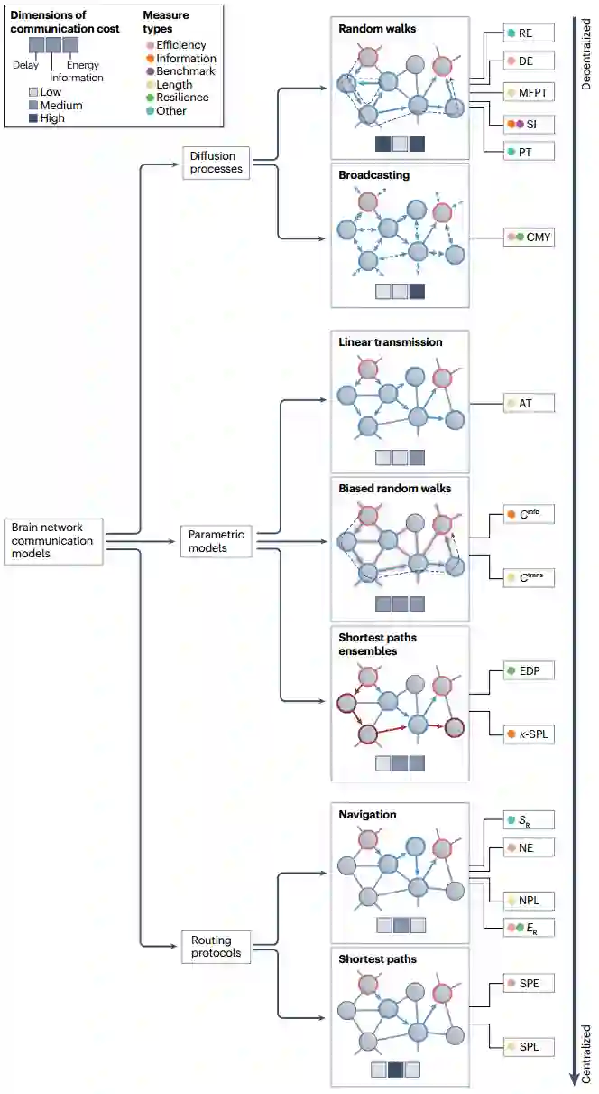 图2 对脑网络通信模型和测量方法的分类。当前的脑网络通信模型可分为三大类——扩散过程、参数模型和路由协议,从分散(上)到集中(下)的策略。每个系列又分为多种通信模型,每种模型都提出特定的策略或算法来引导网络节点间的信号。可以根据通信成本的三个维度:延迟、信息和能量,从概念上评估一种模式的优缺点。这些维度的性能高低用颜色标签表示,分别为低、中或高成本。给定模型的性能可通过一系列通信指标来量化,衡量标准根据其量化的神经通信特征(如信号成本或弹性)进行分组并用颜色编码。AT,激活时间;Cinfo,信息成本;CMY,可交流性;Ctrans,传输成本(相当于 MFPT);DE,扩散效率;EDP,边缘不连接路径;ER,效率比;k-SPL,k-最短路径长度;MFPT,平均首次通过时间;NE,导航效率;NPL,导航路径长度;PT,路径传递性;RE,资源效率;SI,搜索信息;SPE,最短路径效率;SPL,最短路径长度;SR,成功率。图经授权改编自参考文献116。