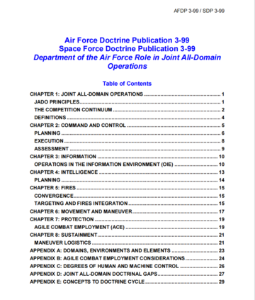 本理论出版物为支持联合全域作战(JADO)的空中和空间部分建立了一个框架。该框架将JADO的愿景与基于作战经验的近期实践方法以及经过战斗检验的作战规划、执行和评估过程结合起来。该出版物指导空军部(DAF)组织和使用提交给联合部队指挥官(JFC)的全部力量和能力。实验、兵棋推演和演习继续完善JADO原则。本出版物的作用,作为新兴的理论,在附录E中有所描述。