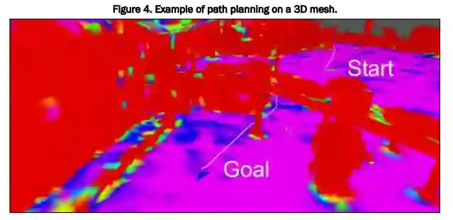 还研究了用于三维路径规划的 mesh_navigation(Pütz,2019 年;Pütz 等,2021 年)。图 3 包含一个网格导航示例。在这个示例中,粉色和蓝色等冷色调表示可穿越的地形,而红色则表示障碍物。使用网格导航的一个好处是,陡坡(即负面障碍物),如楼梯,会被标记为红色并避开。因此,机器人的路径是沿着斜坡规划的。