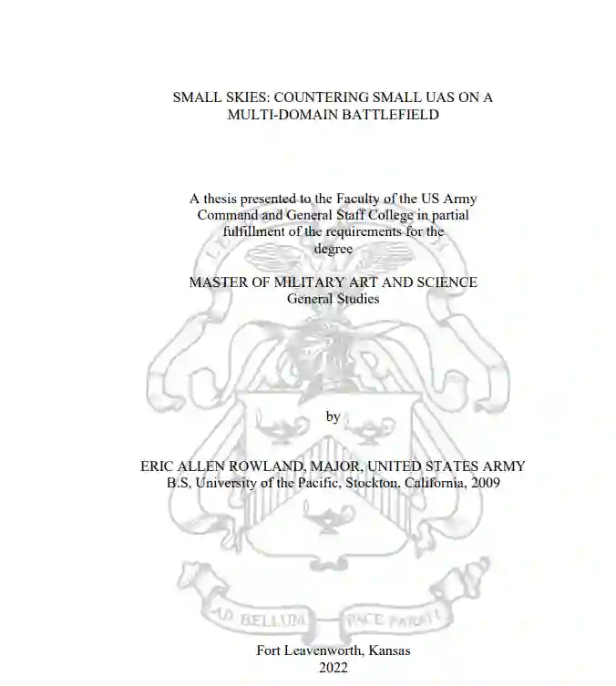 在过去的十年中,世界各地的国家和非国家行为者都采用了小型无人驾驶航空系统(sUAS)来实现战场效果。这篇论文探讨了这些系统在当代行动中的运用方式,以及同行部队在高强度作战行动中可能运用这些系统的方式。还研究了美国防部为打击这种威胁所做的现有工作。通过建立小型无人机系统的使用模型,本论文为战术单位在多领域战场上进行反无人机系统提供了一个基础。最后,它使用威胁模型来描述战术编队在高强度多域作战中进行反无人机系统作战所需的能力,并通过DOTMLPF-P的理论、组织、物资、领导和教育等领域提出变革建议。