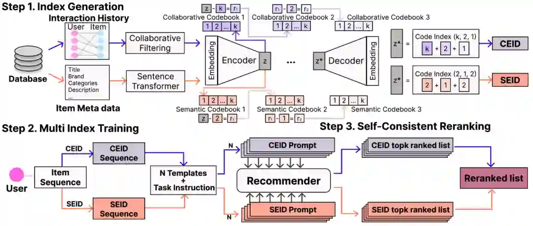 https://arxiv.org/abs/2408.08686 语言模型(LMs)因其先进的语言理解和生成能力,越来越多地被应用于推荐系统中。最近基于生成式检索的推荐系统利用LMs的推理能力,根据用户交互历史中的物品序列直接生成下一个物品的索引标记。以往的研究主要集中在仅基于文本语义或协同信息的物品索引上。然而,尽管这些方面的独立有效性已得到证明,但这些信息的整合仍未得到充分探索。我们的深入分析发现,模型从异构物品索引和多样化输入提示中捕获的知识存在显著差异,这些差异具有很高的互补潜力。在本文中,我们提出了SC-Rec,一个统一的推荐系统,它从两种不同的物品索引和多个提示模板中学习多样化的偏好知识。此外,SC-Rec采用了一种新颖的重排序策略,该策略聚合了一组基于不同索引和提示推断的排序结果,以实现模型的自洽性。我们在三个真实世界数据集上的实证评估表明,SC-Rec显著优于现有的序列推荐方法,有效地整合了模型多样化输出的互补知识。