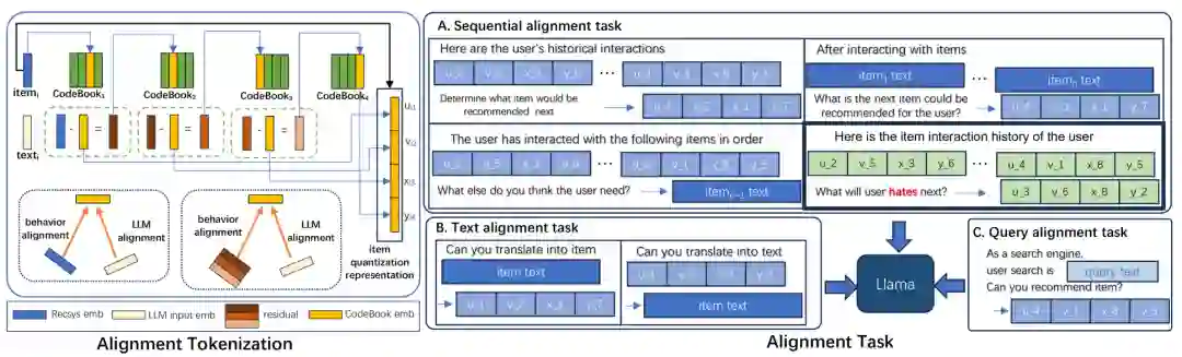 https://arxiv.org/abs/2412.13771 大型语言模型(LLMs)具备卓越的推理能力,能够从用户的历史行为中洞察深层次的兴趣,从而为推荐系统的发展提供了新的可能性。然而,推荐系统中常见的稀疏协同语义与LLMs中的密集标记表示之间仍存在显著差异。在本研究中,我们提出了一种新颖的框架,将传统推荐模型与LLMs的强大能力有机结合。我们通过提出的对齐标记化模块(Alignment Tokenization module),将ItemID转换为与LLMs语义空间对齐的序列,从而启动这一整合过程。此外,我们设计了一系列专门的监督学习任务,旨在将协同信号与自然语言语义的细微差别对齐。为了确保实际应用的可行性,我们通过预缓存每个用户的前K个结果来优化在线推理,从而降低延迟并提高效率。大量的实验证据表明,我们的模型显著提升了召回率指标,并展示了推荐系统卓越的可扩展性。