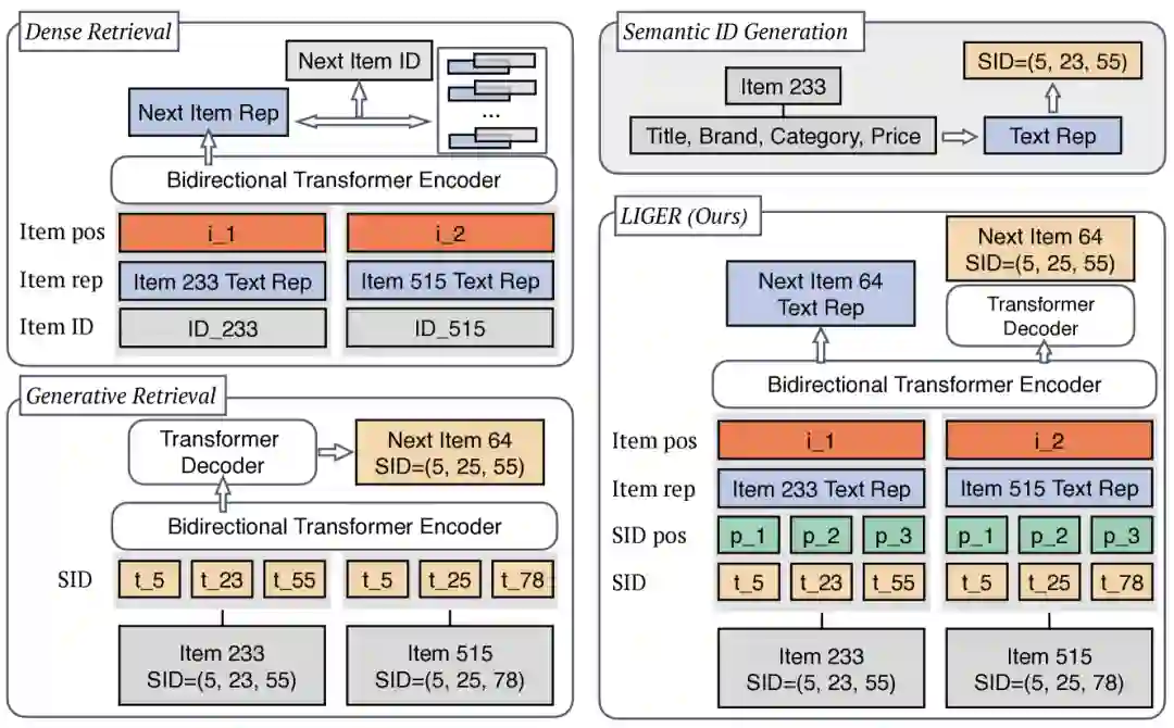 https://arxiv.org/abs/2411.18814 序列密集检索模型利用先进的序列学习技术来计算物品和用户表示,然后通过用户与所有物品表示之间的内积计算来为用户排序相关物品。然而,这种方法需要为每个物品存储唯一的表示,随着物品数量的增加,会导致显著的内存需求。相比之下,最近提出的生成式检索范式提供了一种有前景的替代方案,它通过使用在包含物品语义信息的语义ID上训练的生成模型,直接预测物品索引。尽管生成式检索在大规模应用中具有潜力,但在公平条件下对生成式检索和序列密集检索进行全面比较的研究仍然缺乏,关于性能和计算权衡的问题仍未解决。为了解决这一问题,我们在学术基准上对这两种方法进行了受控条件下的比较,并提出了一种混合模型LIGER(LeveragIng dense retrieval for GEnerative Retrieval),该模型结合了这两种广泛使用方法的优势。LIGER将序列密集检索集成到生成式检索中,缓解了性能差异,并在评估的数据集中增强了冷启动物品推荐。这种混合方法为这些方法之间的权衡提供了见解,并在小规模基准测试中展示了推荐系统效率和有效性的提升。