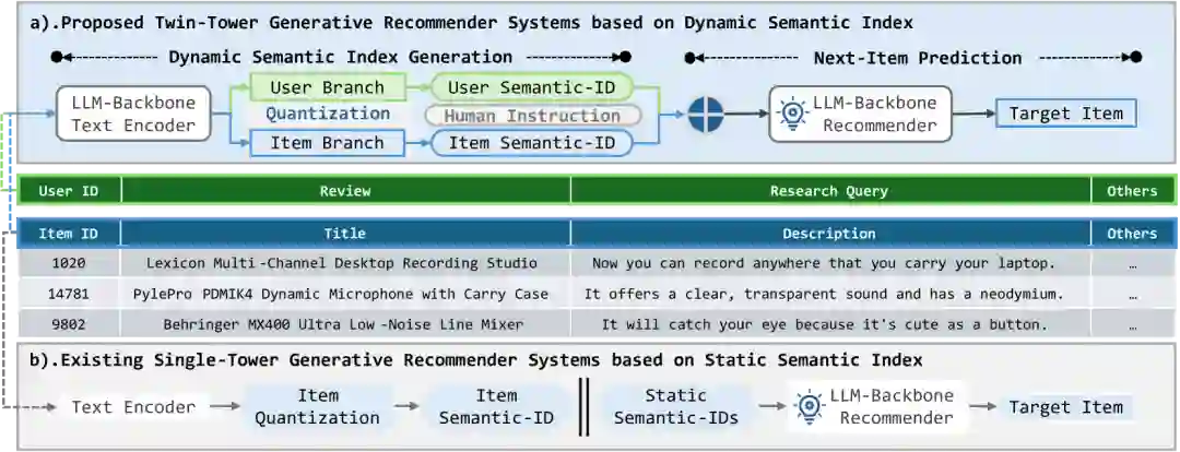 https://arxiv.org/abs/2409.09253 由于在语义理解和逻辑推理方面具备前所未有的能力,预训练的大型语言模型(LLMs)在开发下一代推荐系统(RSs)中展现了巨大的潜力。然而,当前方法采用的静态索引范式极大地限制了LLMs在推荐中的能力利用,不仅导致语义知识与协同知识之间的对齐不足,还忽视了高阶的用户-物品交互模式。本文提出了双塔动态语义推荐系统(TTDS),这是首个采用动态语义索引范式的生成式推荐系统,旨在同时解决上述问题。具体而言,我们首次设计了一个动态知识融合框架,将双塔语义标记生成器集成到基于LLM的推荐系统中,分层地为物品和用户分配有意义的语义索引,并据此预测目标物品的语义索引。此外,我们提出了一种双模态变分自编码器,以促进语义知识与协同知识之间的多粒度对齐。最后,我们提出了一系列专门定制的调优任务,用于捕捉高阶用户-物品交互模式,从而充分利用用户历史行为。在三个公开数据集上进行的大量实验证明了所提方法在开发基于LLM的生成式推荐系统中的优越性。与领先的基线方法相比,所提出的TTDS推荐系统在命中率(Hit-Rate)和归一化折损累计增益(NDCG)指标上分别平均提升了19.41%和20.84%。
