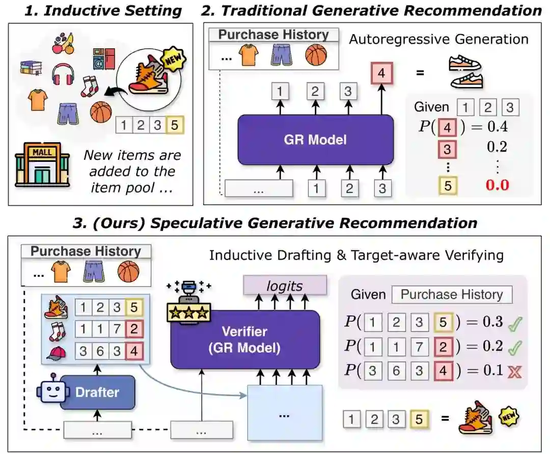 https://arxiv.org/abs/2410.02939 生成式推荐(GR)是一种新兴的范式,它将物品标记为离散的标记,并学习自回归生成下一个标记作为预测。尽管有效,GR模型在转导式设置下运行,这意味着它们只能生成训练期间见过的物品,而无法应用启发式重排序策略。在本文中,我们提出了SpecGR,一个即插即用的框架,使GR模型能够在归纳式设置下推荐新物品。SpecGR使用具有归纳能力的起草模型来提出候选物品,这些候选物品可能包括现有物品和新物品。然后,GR模型充当验证器,接受或拒绝候选物品,同时保留其强大的排序能力。我们进一步引入了引导式重起草技术,使提出的候选物品更符合生成式推荐模型的输出,从而提高验证效率。我们考虑了两种起草变体:(1)使用辅助起草模型以获得更好的灵活性,或(2)利用GR模型自身的编码器进行参数高效的自起草。在三个真实世界数据集上的大量实验表明,SpecGR不仅表现出强大的归纳推荐能力,而且在比较方法中具有最佳的整体性能。