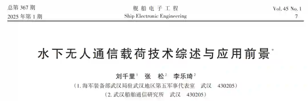 摘 要 水下无人通信载荷技术是现代水下作战和民用海洋探索中不可或缺的核心技术,直接影响无人潜航器(UUV) 的任务执行能力和作业效率。论文从通信载荷的技术现状、关键技术以及未来发展趋势三方面对其进行综述,重点探讨水 声通信、光通信、蓝绿激光通信、无线电通信以及磁感应通信的技术特点与应用场景,分析多模态通信载荷在复杂水下环境 中的协同性与适应性。通过对典型应用的研究,论文总结了通信载荷在军事和民用领域中的实践价值,并展望其在智能化、 模块化、多样化方向的未来发展潜力,为推动水下通信技术的发展和无人潜航器的广泛应用提供理论支持与技术参考。 关键词 水下通信载荷;无人潜航器;多模态通信;智能化通信;深海探索