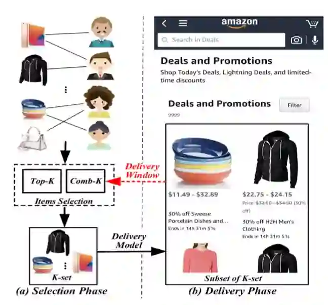 在信息爆炸的时代,推荐系统已经成为一种高效发现用户偏好的手段。多种多种的推荐范式也不断涌现。作为一种新颖的推荐范式,促销推荐可以很好的刺激用户购买欲望进而最大化收益。不同于传统的推荐(如商品推荐和组推荐), 促销推荐(如图1所示)旨在在选择阶段考虑所有用户的偏好来选择一组K个商品并最大化投放阶段的收益。尽管上述两个阶段高度关联,现有的算法通常只关注于商品选择阶段,极大的忽略了投放阶段进而导致次优的结果。为了更好的解决促销推荐问题,我们提出了一种Comb-K推荐模型,一种带约束的组合优化问题。通过精心设计的一些约束,Comb-K可以无缝的整合选品与投放两个阶段,进而达到最优的投放效果。特别的,即使我们在选品阶段选择了K个商品构成了K-set,用户来投放阶段也只能看到K-set中的W个。而只有被用户看到的商品才可能真正的产生投放收益。尽管上述2个阶段高度相关,但是现有的算法并没有很好的考虑它,进而导致了次优的结果。