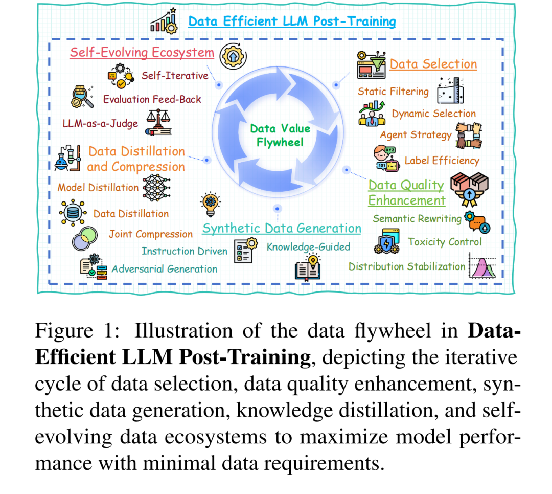 大语言模型(Large Language Models, LLMs)的后训练(post-training)已成为释放其领域自适应能力与任务泛化潜能的关键阶段(Luo et al., 2025b)。这一阶段显著提升了模型在长上下文推理(Zelikman et al., 2022; Yuan et al., 2024c)、人类对齐(human alignment)(Rafailov et al., 2024)、指令微调(instruction tuning)(Zhang et al., 2023b)以及领域特定自适应(domain-specific adaptation)(Cheng et al., 2024)等方面的能力。 在大语言模型的后训练阶段,数据是驱动模型进化的核心力量。然而,当前的后训练范式正面临严重的数据困境: 一方面,高质量数据的人工标注成本急剧上升;另一方面,单纯扩大数据规模带来的性能提升呈现明显的边际递减效应。此外,静态数据集天然限制了模型对动态现实知识的持续适应能力。这种模型性能与数据规模之间的线性依赖关系,从根本上源于传统后训练范式中数据利用效率的低下。 近期的 DeepSeek-R1(Guo et al., 2025)取得的成功进一步印证了这一点——该模型通过引入强化学习实现了数据高效的后训练,显著提升了模型性能,充分展示了数据高效方法的有效性与必要性。 为此,本文构建了首个关于数据高效大语言模型训练的系统性综述,旨在通过一个统一化与体系化的框架整合这一领域碎片化的研究成果。我们的研究揭示,突破效率瓶颈的关键并非单纯扩大数据规模,而在于贯穿数据生命周期的价值提取机制。 学术界已探索出多种策略来充分挖掘后训练阶段的数据潜能(Jeong et al., 2024; Wang et al., 2024a; Pan et al., 2024b)。虽然这些方法在提升数据效率方面取得了显著进展,但目前仍缺乏系统性的综述与统一视角。 本文从**数据中心视角(data-centric perspective)出发,全面综述了数据高效大语言模型后训练的研究进展。我们提出了一个名为“数据价值飞轮(data value flywheel)”**的概念(如图1所示),该框架由以下五个关键组成部分构成: 1. 数据选择(Data Selection), 1. 数据质量提升(Data Quality Enhancement), 1. 合成数据生成(Synthetic Data Generation), 1. 数据蒸馏与压缩(Data Distillation and Compression), 1. 自演化数据生态系统(Self-evolving Data Ecosystems)。