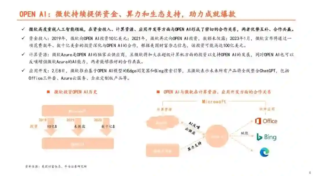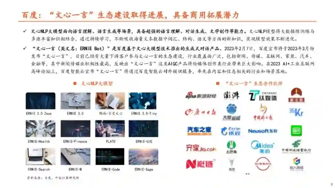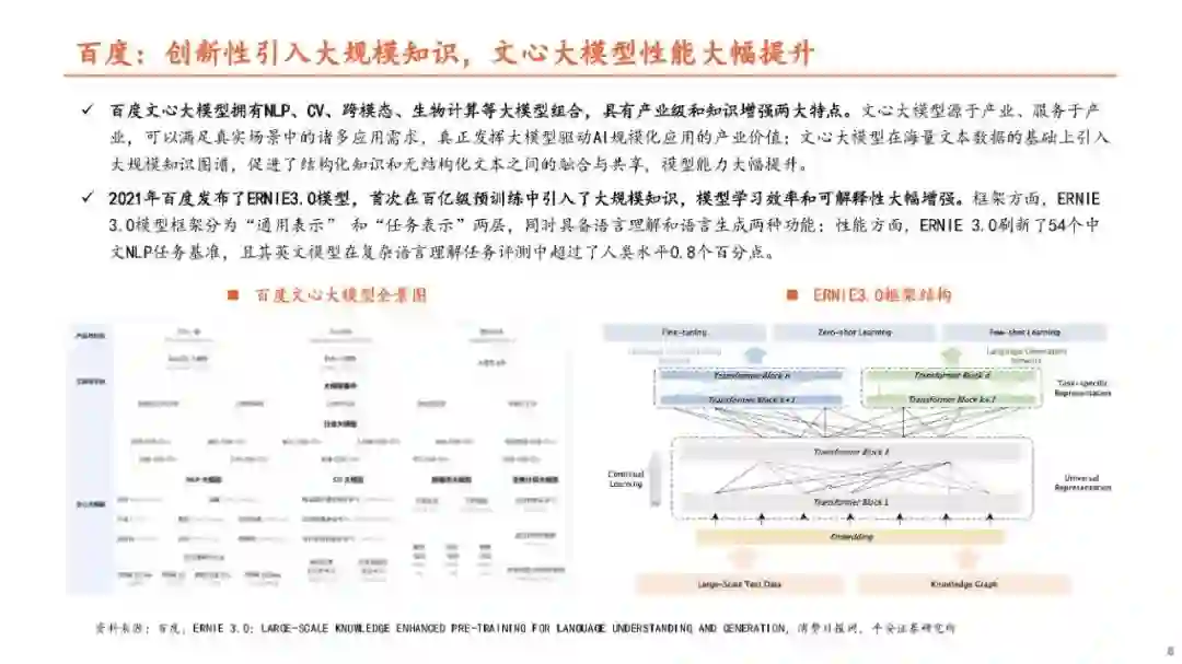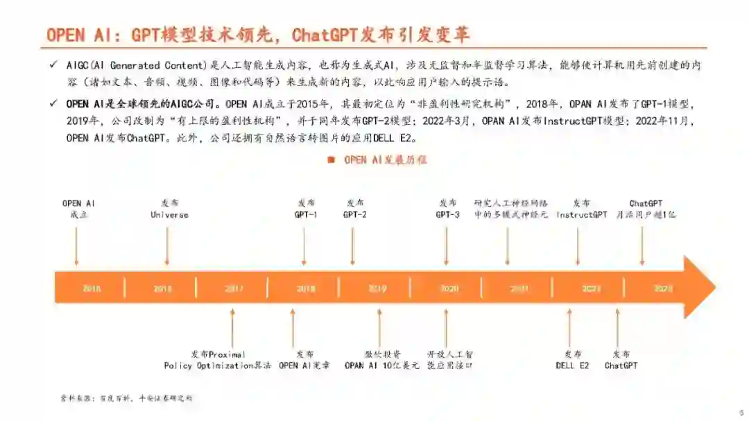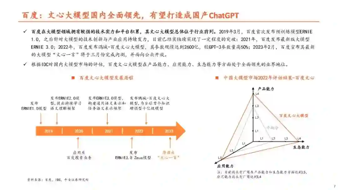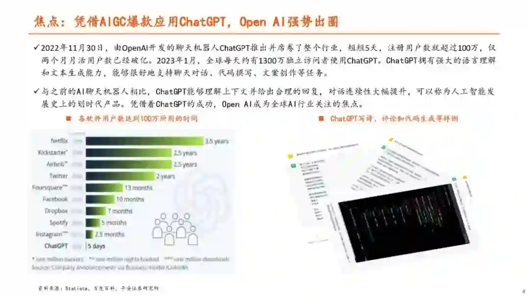 ChatGPT带火AIGC,OpenAI引领技术和生态。2022年11月,由OpenAI开发的聊天机器人ChatGPT推出并席卷了整个行业,其引入人类反馈的强化学习和监督学习训练方法,具备优秀的聊天对话、文案创作、代码编写等功能,且得到了微软的倾力支持,成为史上用户增长最快的消费应用。聚焦国内,百度在大模型领域积累深厚,总体水平处于行业前端,其创新性引入大规模知识图谱,模型性能得到大幅提升,公司近期宣布其“文心一言”产品将于2023年3月完成内测并面向公众开放,下游关注度极高,目前已经得到新闻传媒、互联网、金融等多个行业客户的广泛支持。