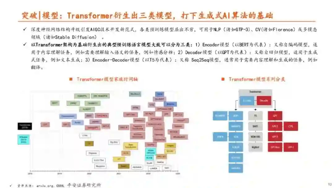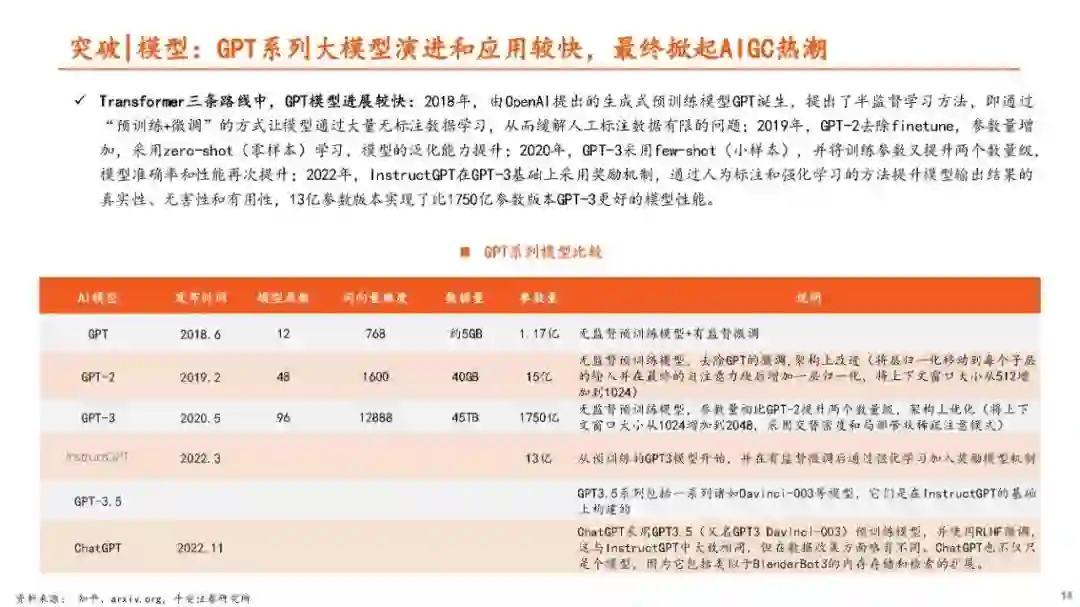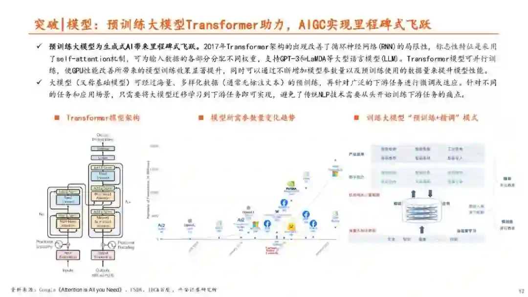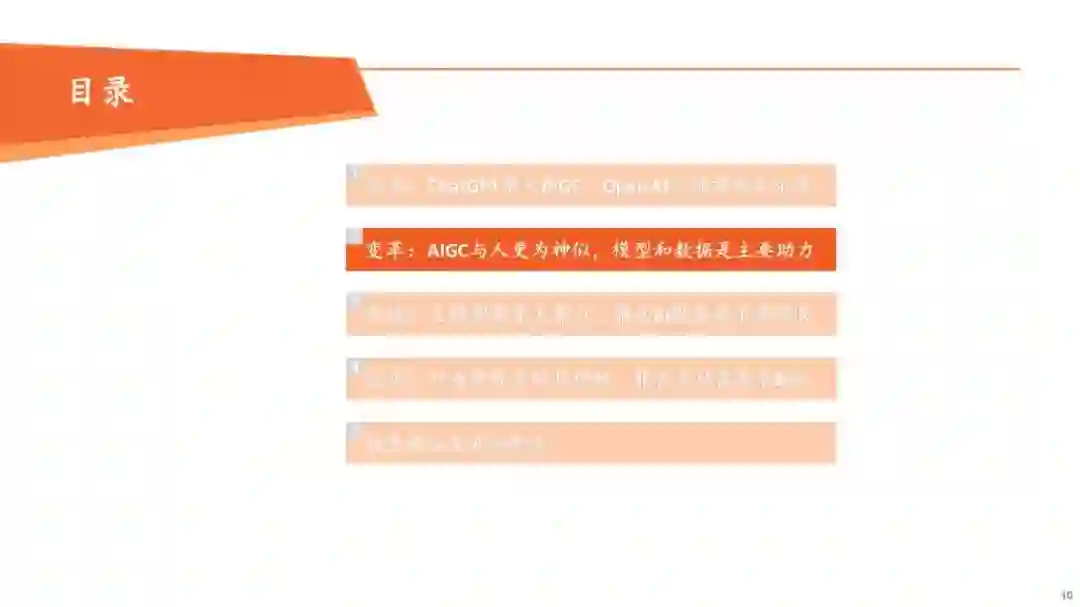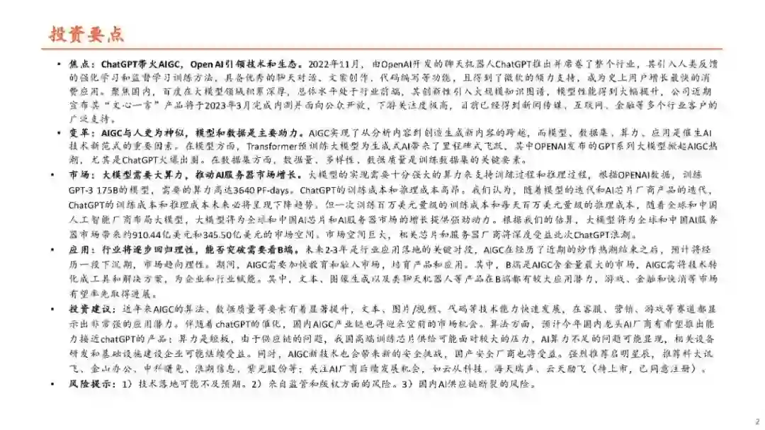 变革:AIGC与人更为神似,模型和数据是主要助力。AIGC实现了从分析内容到创造生成新内容的跨越,而模型、数据集、算力、应用是催生AI技术新范式的重要因素。在模型方面,Transformer预训练大模型为生成式AI带来了里程碑式飞跃,其中OPENAI发布的GPT系列大模型掀起AIGC热潮,尤其是ChatGPT火爆出圈。在数据集方面,数据量、多样性、数据质量是训练数据集的关键要素。 市场:大模型需要大算力,推动AI服务器市场增长。大模型的实现需要十分强大的算力来支持训练过程和推理过程,根据OPENAI数据,训练GPT-3175B的模型,需要的算力高达3640PF-days。ChatGPT的训练成本和推理成本高昂。我们认为,随着模型的迭代和AI芯片厂商产品的迭代,ChatGPT的训练成本和推理成本未来必将呈现下降趋势。但一次训练百万美元量级的训练成本和每天百万美元量级的推理成本,随着全球和中国人工智能厂商布局大模型,大模型将为全球和中国AI芯片和AI服务器市场的增长提供强劲动力。根据我们的估算,大模型将为全球和中国AI服务器市场带来约910.44亿美元和345.50亿美元的市场空间。市场空间巨大,相关芯片和服务器厂商将深度受益此次ChatGPT浪潮。 应用:行业将逐步回归理性,能否突破需要看B端。未来2-3年是行业应用落地的关键时段,AIGC在经历了近期的炒作热潮结束之后,预计将经历一段下沉期,市场趋向理性。期间,AIGC需要加快教育和融入市场,培育产品和应用。其中,B端是AIGC含金量最大的市场,AIGC需将技术转化成工具和解决方案,为企业和行业赋能。其中,文本、图像生成以及类聊天机器人等产品在B端都有较大应用潜力,游戏、金融和快消等市场有望率先取得进展。