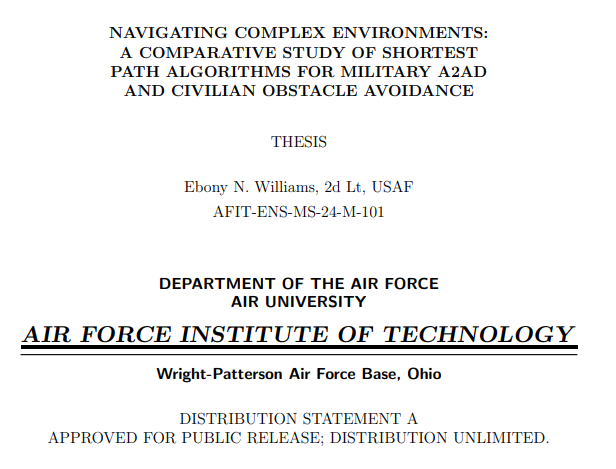 本文通过双重聚焦研究,深入探讨最短路径算法在军事与民用领域的实际应用。通过构建两篇独立文章,本研究旨在建立统一框架以应对各领域特有挑战。通过剖析军事反介入/区域拒止(A2AD)环境与障碍密集的民用场景中路径规划的复杂性,研究致力于为多场景适应性解决方案奠定理论基础。首篇论文(第二章)聚焦民用领域,重点研究障碍密集环境下的导航问题;次篇论文(第三章)则着力解决军事环境中遭遇的复杂挑战。