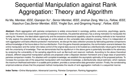 成对比较的排名聚合广泛应用于社会学、政治学、经济学、心理学、体育等领域。鉴于其巨大的社会影响和随之而来的激励措施,潜在的对手有强烈的动机来操纵排名列表。然而,理想的攻击机会和过度的对抗能力使现有方法难以实际操作。为了充分探索潜在的风险,我们利用了在线攻击脆弱的数据收集过程。由于它独立于排名聚合并且缺乏有效的保护机制,我们通过伪造成对比较来干扰数据收集过程,而无需了解未来的数据或真实分布。从博弈论的角度来看,在线操纵者与控制原始数据源的排名者之间的对抗场景被表述为应对知识不确定性的分布鲁棒博弈。然后我们通过分析Bernoulli和水库等采样算法的脆弱性,证明了在上述博弈中,均衡可能对对手有利。根据上述理论分析,我们在贝叶斯决策框架和一大类参数成对比较模型下提出了不同的序列操作策略。对于完全掌握知识的攻击者,我们建立了所提出策略的渐近最优性。为了提高在不完全知识下进行序列操作的成功率,一个分布鲁棒估计器替代了鞍点问题中的最大似然估计,提供了一个保守的数据生成解决方案。最后,验证性的实证结果表明,所提出的方法能够以序列方式操纵排名聚合方法的结果。
