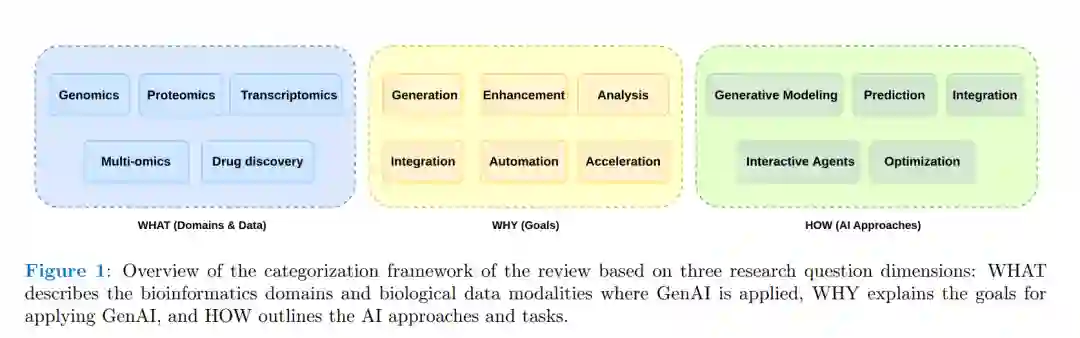 通过这些维度,本研究旨在提供一个全面而综合的视角,展示GenAI如何重塑生物信息学研究与实践。