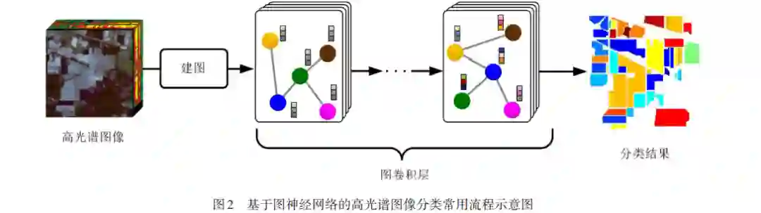 高光谱成像是遥感领域的一项先进技术,它能够收集和处理来自不同波段的电磁光谱信息,包括可见 光、近红外和红外波段. 由于高光谱成像技术能够检测到光谱信息的细微变化,因此,其在区分不同类型的地物方面 取得了不错的成果. 近年来,高光谱图像分类在城市规划和植被监测等应用中引起了许多研究者的关注,其主要目的 是将图像中的每个像素分类到一个有意义的类别中. 然而,高光谱图像数据量大、特征维数高的问题给像素的精确分 类带来了一定挑战. 如何有效提取高光谱图像的空谱特征已成为高光谱图像分类中最重要的问题之一. 在过去的几 年里,深度学习技术依靠强大的特征提取能力,在高光谱图像分类中具有不错的表现 . 其中,基于图神经网络(Graph Neural Network,GNN)的方法凭借其处理不规则数据的出色能力,为高光谱图像分类提供了新的研究方向. 图神经网络是一种能够直接处理图结构数据的深度学习模型. 在图神经网络模型中,每个图节点表示一个样本, 每条边表示一对样本之间的关系. 图卷积操作通过在图节点之间传播信息,来学习图节点的表征,从而模型能够捕捉 到图节点之间的复杂关系,并实施诸如节点分类和链接预测的任务. 通过将高光谱图像转换为图结构,图神经网络能 够在卷积过程中提取图像的空谱特征. 其中,每个节点对应于一个像素或区域,像素或区域之间的关系被表示为边. 本文从图神经网络的构图方式、图卷积类型、模型架构和优化策略4个角度,梳理了当前基于图神经网络的高光谱图 像分类方法的研究内容和进展,并为该领域的技术研究提供了多层次的对比分析. 在基于图神经网络的高光谱图像分类方法中,图结构的构建是一项非常重要的任务. 目前,主要存在两种基于高 光谱数据的建图方法,即基于像素和基于区域的方法. 在基于像素的建图方法中,每个像素都被视为一个图节点,这 也是构建图结构最直接的方法. 其中,每对图节点之间的权重可以由网络预先计算或学习. 考虑到基于像素的建图方 法复杂度较高,研究者开发了基于区域的建图方法. 此类方法将图像的区域作为图节点,目前已被广泛应用于高光谱 图像分类方法中. 基于区域的建图方法可以有效减小图结构的尺寸,从而实现高效的图卷积运算. 此外,图卷积类型的选择也是基于图神经网络的高光谱图像分类中的一个重要问题. 当前的图卷积操作主要包 含两种类型,即基于谱域的图卷积和基于空间域的图卷积. 基于谱域的图卷积从图信号处理的角度引入了滤波器,通 常具备较为坚实的数学基础,并且在高光谱图像分类中得到了较为广泛的使用. 与基于谱域的方法不同,基于空间域 的图卷积利用加权平均函数直接对每个图节点的邻居进行卷积. 因此,基于空间域的图卷积通常表现出更强的灵活 性和泛化能力. 同时,模型架构的选择在基于图神经网络的高光谱图像分类中同样关键. 目前主要存在两种类型的模型架构,即 单一型和混合型. 基于单一型架构的方法仅使用单一类型的深度模型(即图神经网络),早期的基于图神经网络的高 光谱图像分类方法大多采用这一架构. 然而,图神经网络模型本身存在一些固有的缺陷,这一定程度上限制了单一型 架构方法在高光谱图像分类任务中的表现. 为了缓解图神经网络模型的固有缺陷,进一步提高算法在高光谱图像分 类任务中的性能,研究者开始探索将图神经网络与其他深度模型相融合的混合型模型架构,从而能够利用不同子模型 来捕捉高光谱图像中多种类型的空谱特征. 模型优化策略的选择对于算法性能也有着显著的影响. 目前主要存在两种模型优化策略,即全批量梯度下降和 小批量梯度下降. 全批量梯度下降法会遍历所有样本计算一次损失函数,然后根据各个参数对应的梯度来更新模型 参数,这种优化策略通常用于基于谱域的图神经网络模型. 然而,由于每一次的参数更新都会涉及所有样本,因此全 批量梯度下降法的复杂度通常较高,尤其是像素或超像素数量较多时. 为了提高训练效率,研究者提出使用小批量梯 度下降进行模型优化. 其中,损失可以根据每个子图计算得到. 由于每个子图的规模比原始图结构小得多,因此小批 量梯度下降策略通常具有很高的效率. 尽管图神经网络模型已经在高光谱图像分类任务中取得了一定成果,但现有方法仍存在一些问题有待改进. 例 如自适应邻域构建,即邻域的大小和形状可以根据图像的不同区域变化. 现有的基于图神经网络的方法通常假设邻 域大小和形状是固定不变的,而这一假设对于图像的所有区域而言可能并非最优. 此外,另一个问题是可伸缩性和准 确性之间的权衡. 图神经网络在获得可伸缩性的同时,无可避免地会对原始数据的完整性造成损伤. 然而,保持数据 的完整性对模型学习是至关重要的. 因此,越来越多学者开始研究能够同时保证可扩展性和高分类精度的图神经网络方法. 同时,由于高光谱图像可能包含各种类型的噪声,因此噪声的处理亦是一个值得关注的问题. 大部分现有的 图神经网络方法对噪声不具有鲁棒性,这更加凸显了开发噪声鲁棒图神经网络方法的必要性. 总的来讲,由于基于图神经网络的方法能够有效提取高光谱图像中的空谱特征,其在高光谱图像分类领域展 现了巨大的潜能 . 本文从不同角度回顾并总结了当前基于图神经网络的高光谱图像分类方
