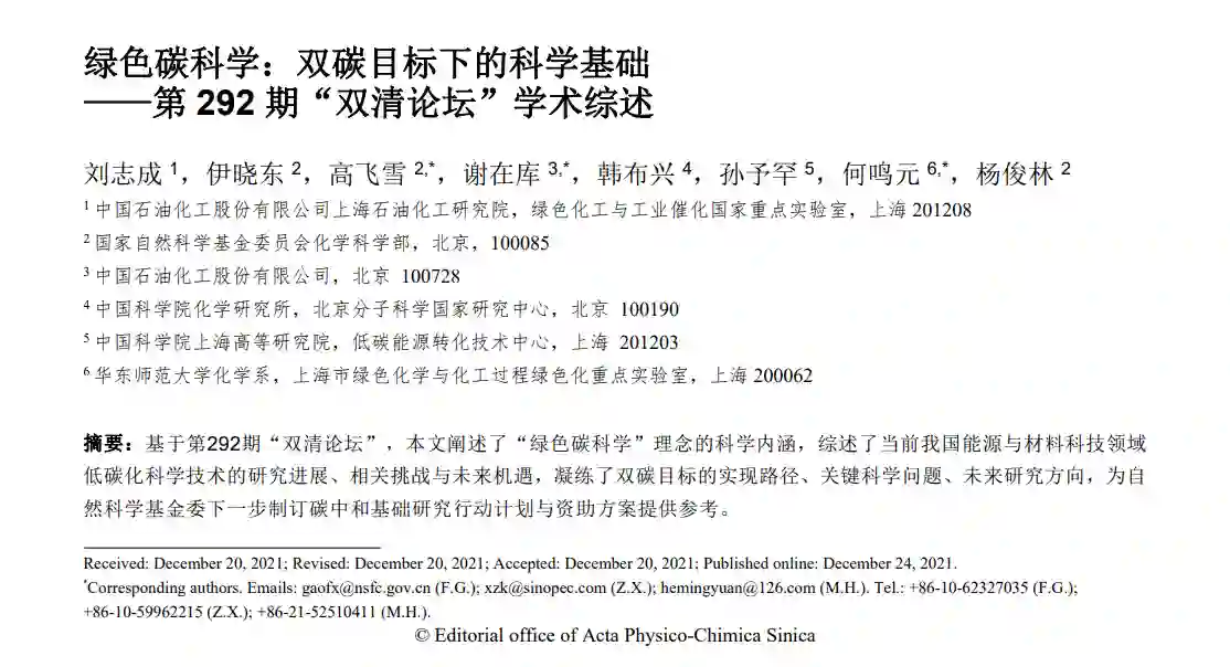 摘要:基于第292期“双清论坛”,本文阐述了“绿色碳科学”理念的科学内涵,综述了当前我国能源与材料科技领域低碳化科学技术的研究进展、相关挑战与未来机遇,凝练了双碳目标的实现路径、关键科学问题、未来研究方向,为自然科学基金委下一步制订碳中和基础研究行动计划与资助方案提供参考。
