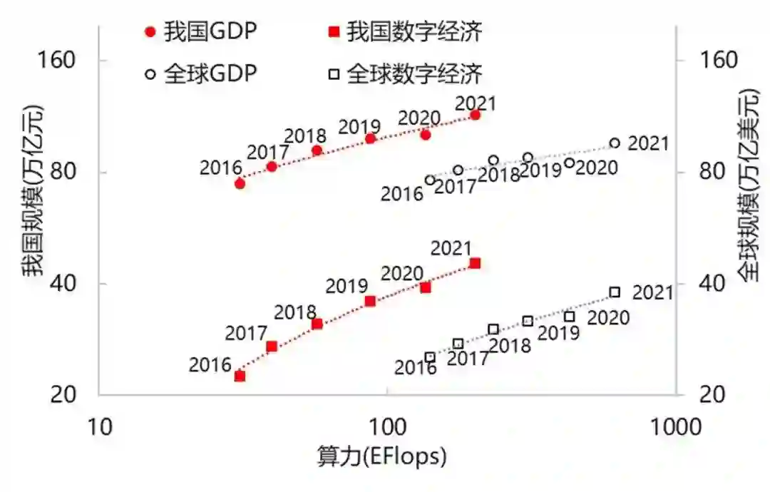 **2. 我国开启算力赋能数字经济新篇章。**2021年我国算力发展水平实现稳步提升,算力规模持续扩大,其中智能算力增速为85%。算力发展对我国GDP增长的拉动作用显著。