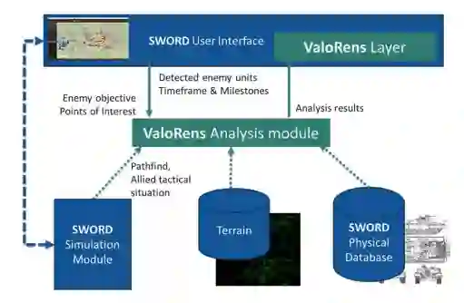 地面部队面临的一个主要挑战是,需要对战术态势达到一定程度的理解,以便能够预判敌方未来可能的机动行动。本项目重点在于提升在高度受限的时间窗口内利用更多信息的能力,从而为战术指挥官提供快速决策要素。瓦洛伦斯项目包含于一个始于2021年的作战背景中,该背景由MASA集团和法国陆军总部数字局主导的一项研究奠定。此项工作的目标是开发一种能够基于对敌方目标、机动和能力的探测与分析,来估算其未来位置的工具。我们的项目主要聚焦于营和连级层面,并重度依赖SWORD仿真软件包和人工智能算法。此外,它还生成初始数据并显示用于测试我们解决方案的分析结果。在不久的将来,该项目将作为分析组件集成到“蝎子”(SCORPION)战斗信息系统中。在本文中,首先描述了所考虑的条令基础、假设和用例。接着,我们详细描述了已完成的工作以及初步评估结果。最后,我们概述了所认为的项目逻辑推进步骤,重点放在敌方战斗序列识别和行为分析上。