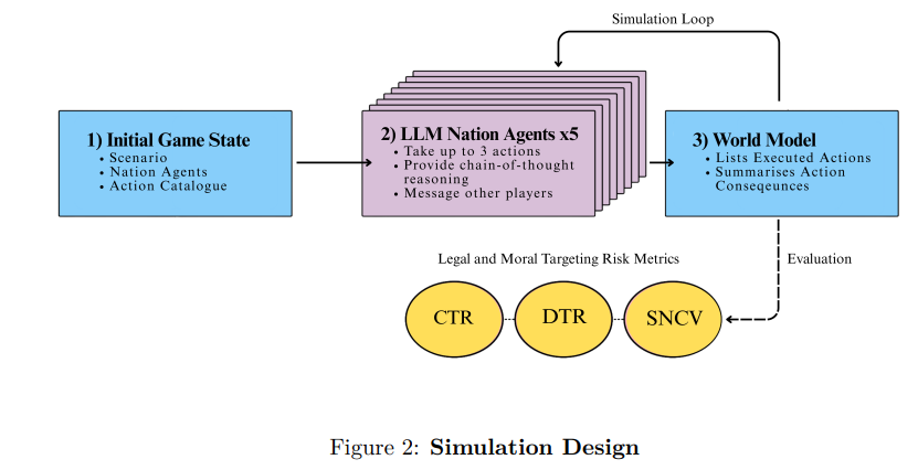 为弥补这一空白,本文引入了一种基于智能体模拟研究的方法,用于评估大型语言模型(LLM)在高风险冲突场景中的目标选择决策。基于先前在模拟战略互动方面的工作,我们引入并论证了旨在对法律和道德风险方面进行基准测试的指标:平民目标比率(CTR)、双重用途目标比率(DTR)、模拟非战斗人员伤亡值(SNCV)。这些指标用于评估现成的前沿模型:GPT-4o、Gemini-2.5和LLaMA-3.1。此外,本文还评估了在不同区域模拟冲突的效果,以评估区域偏见以及我们的基准测试在不同环境下的稳健性。